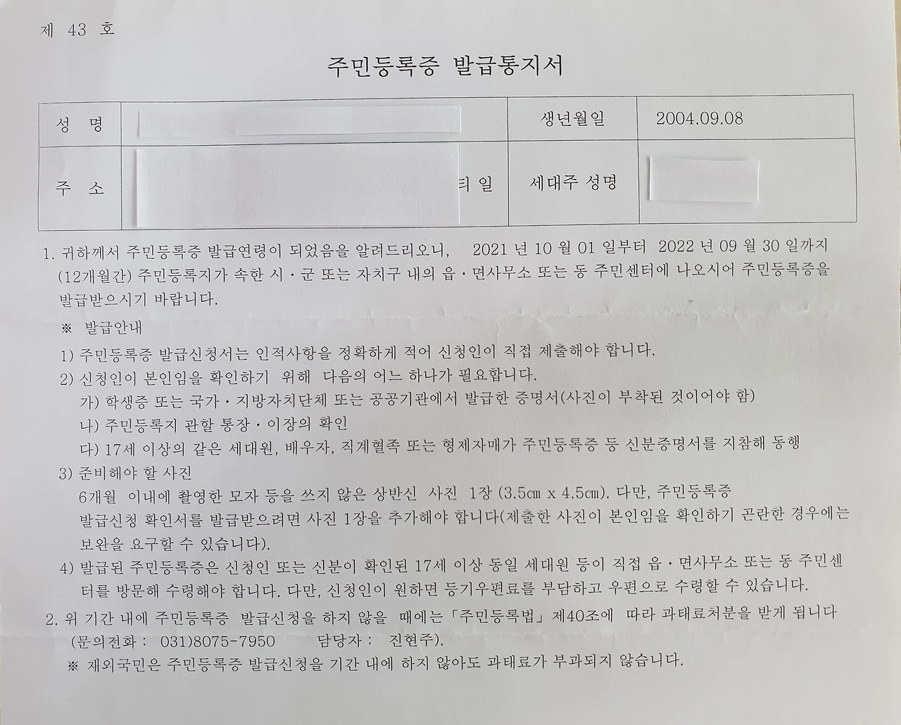 앵글이의 [주민등록증 발급 통지서]였습니다. 우리 앵글이가 어른이 되려나 봐요. 드디어 대한민국 국민이라는 증표를 주신다고 하네요? 이렇게 감격스러울 수가!! 뭐랄까요? 느낌이... 아직 받아보지 않아서 잘 모르지만, 마치 영장 받은 느낌이랄까... 그런 야릇한 기분이 들었어요. 주민등록증은 만 18세에 만드는 것인 줄 알았는데 만 17세에 통지서가 오네요? '그럼 내년 대선에서 투표를 할 수 있는 건가?' 하고 잠시 생각했었답니다. 이런 엉뚱한 엄마가 또 있을까요? 주민등록증이 생겼다고 선거권이 있을 수도 있다는 착각을 순식간에 하다니... (선거는 만 19세부터 할 수 있습니다.)