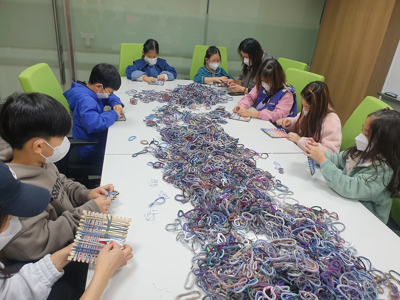 로운의 [똥손놀이터] 양말목으로 티코스터 만들기 : 30분 단위 한 그룹 12명씩 7번의 수업이 있었습니다.