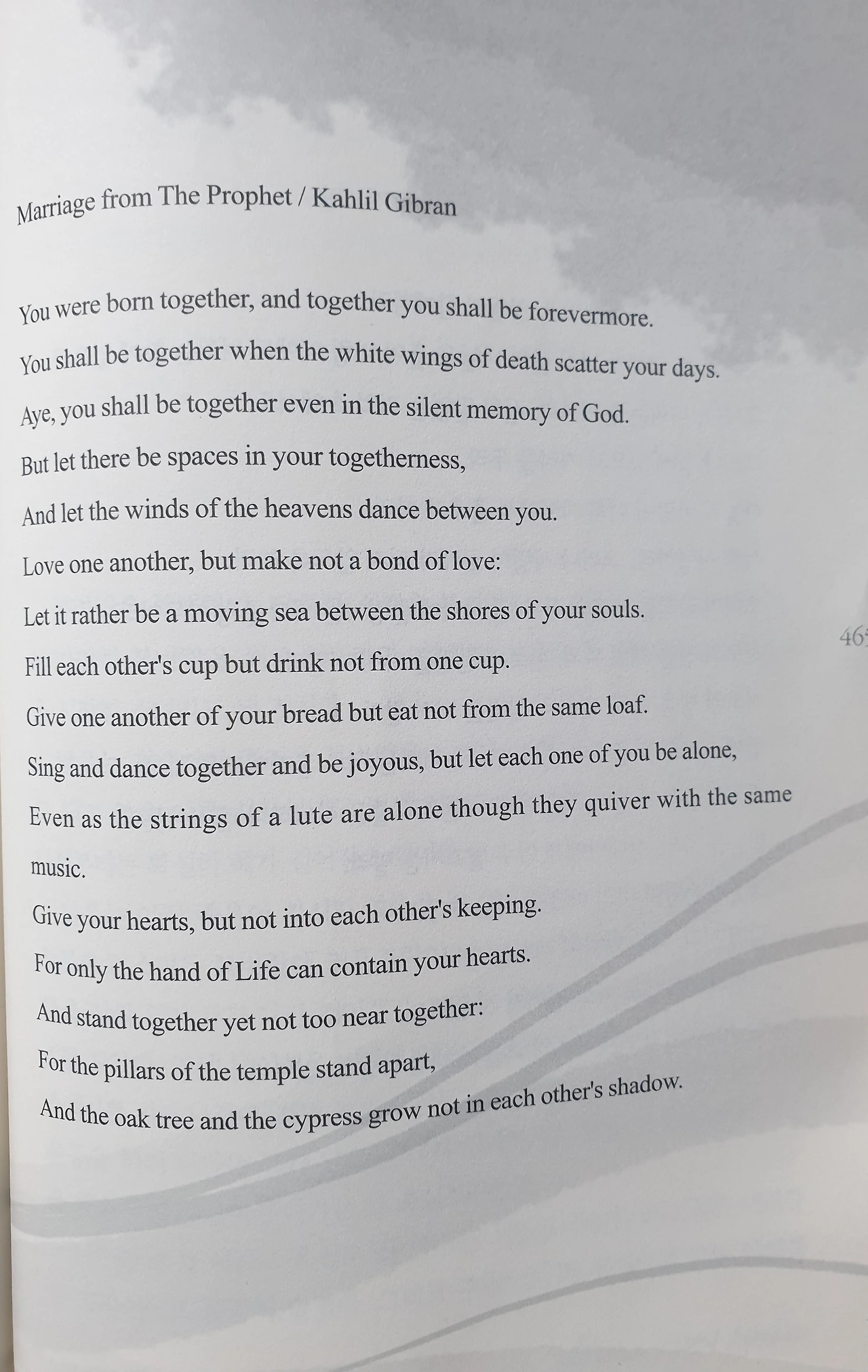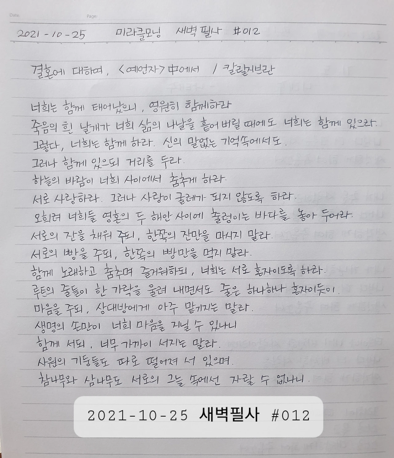 2021-10-25 / 새벽 필사를 할 시는 [결혼에 대하여, <예언자> 중에서 /칼릴 지브란]입니다.