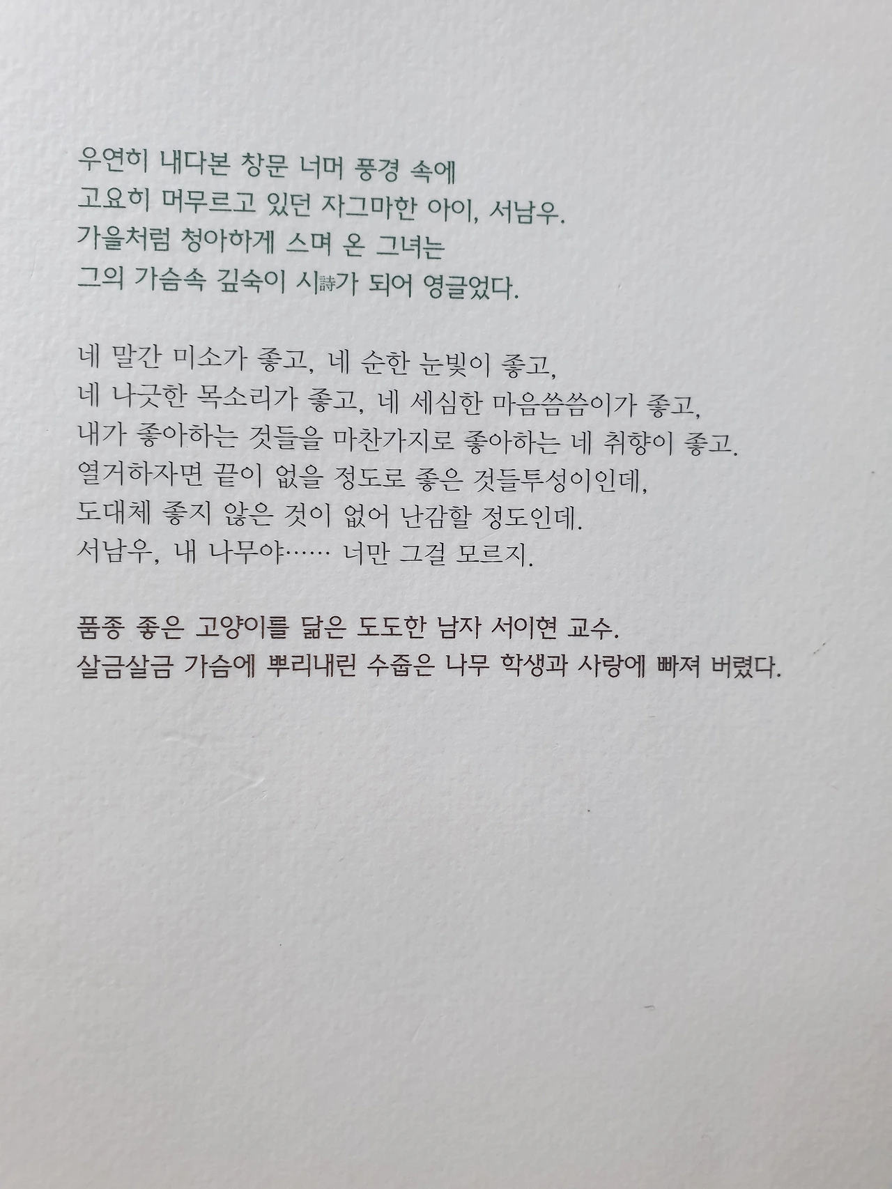 전혀 유치하지 않고 아름다운 사랑이야기가 담겨있습니다. 중간중간 소개된 '영시'를 감상하는 재미와 매력이 있습니다. 20편의 영시가 소설 속 스토리와 잘 맞아떨어져 잔잔하게 스며드는 감동이 있습니다. 밤을 꼴딱 새워 가며 오랜만에 청춘을 소환해서 읽었던 책을 소개합니다. 오글거리고 간질간질한 책이 가끔은 생활에 활력을 주기도 합니다. 최근 무거운 책들을 많이 읽으셨다면 가볍게 로맨스 소설 한 편 어떠신가요?