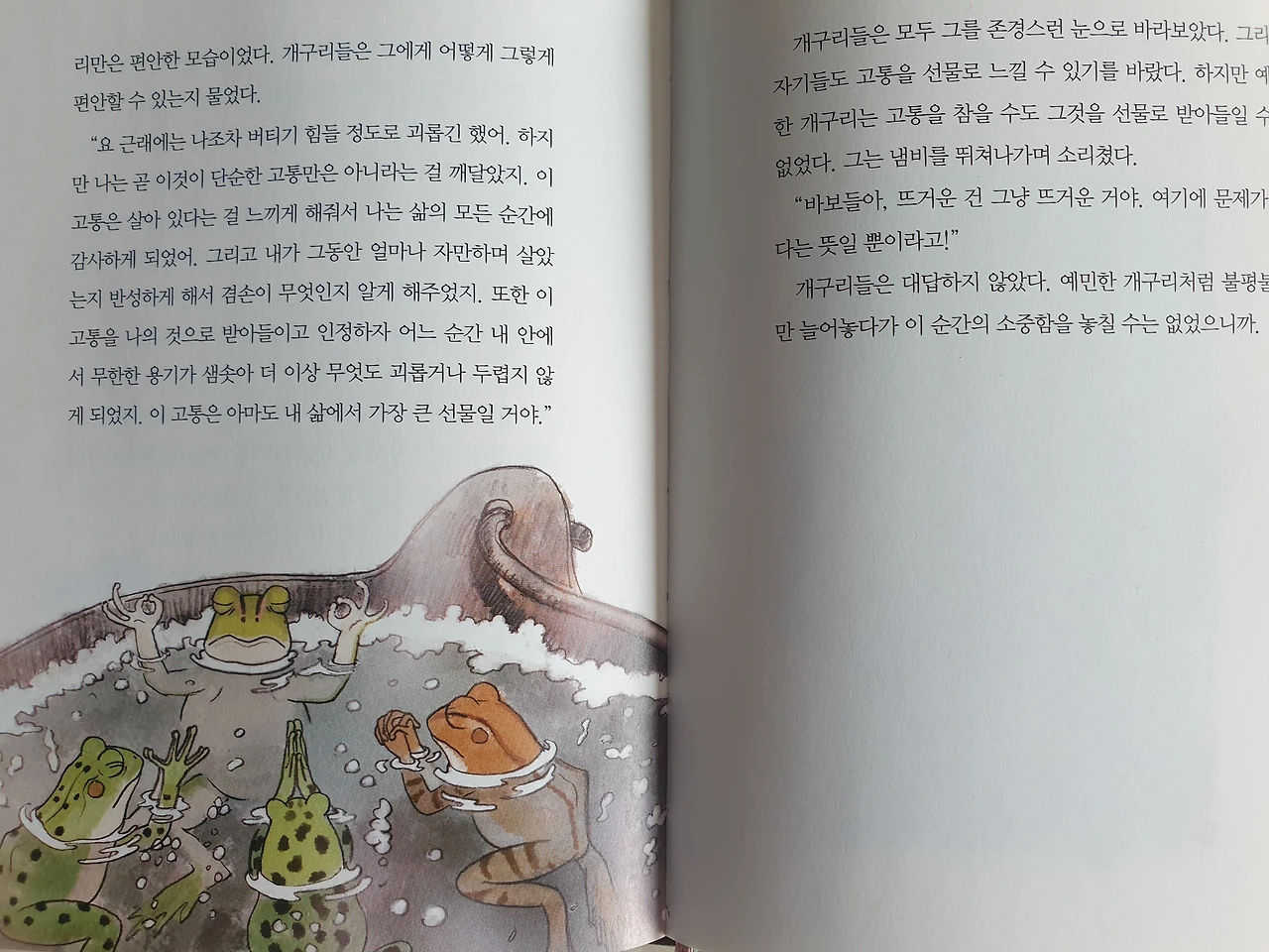 개구리를 처음부터 뜨거운 물에 집어넣었다면 바로 뛰쳐나왔을 것입니다. 찬 물에서 서서히 달아오르니 죽을지도 모를 현실을 깨닫지 못했습니다. 현실을 직시하고 뛰쳐나온 개구리 한 마리만 살아남았죠. 나는 과연 끓어오르는 냄비 속에서 안주하며 살아가고 있을까요? 변화와 도전을 시도하고 현실에 안주하지 않으면 지금보다 한 걸음 더 나아갈 수 있을 않을까 생각해 보았습니다.