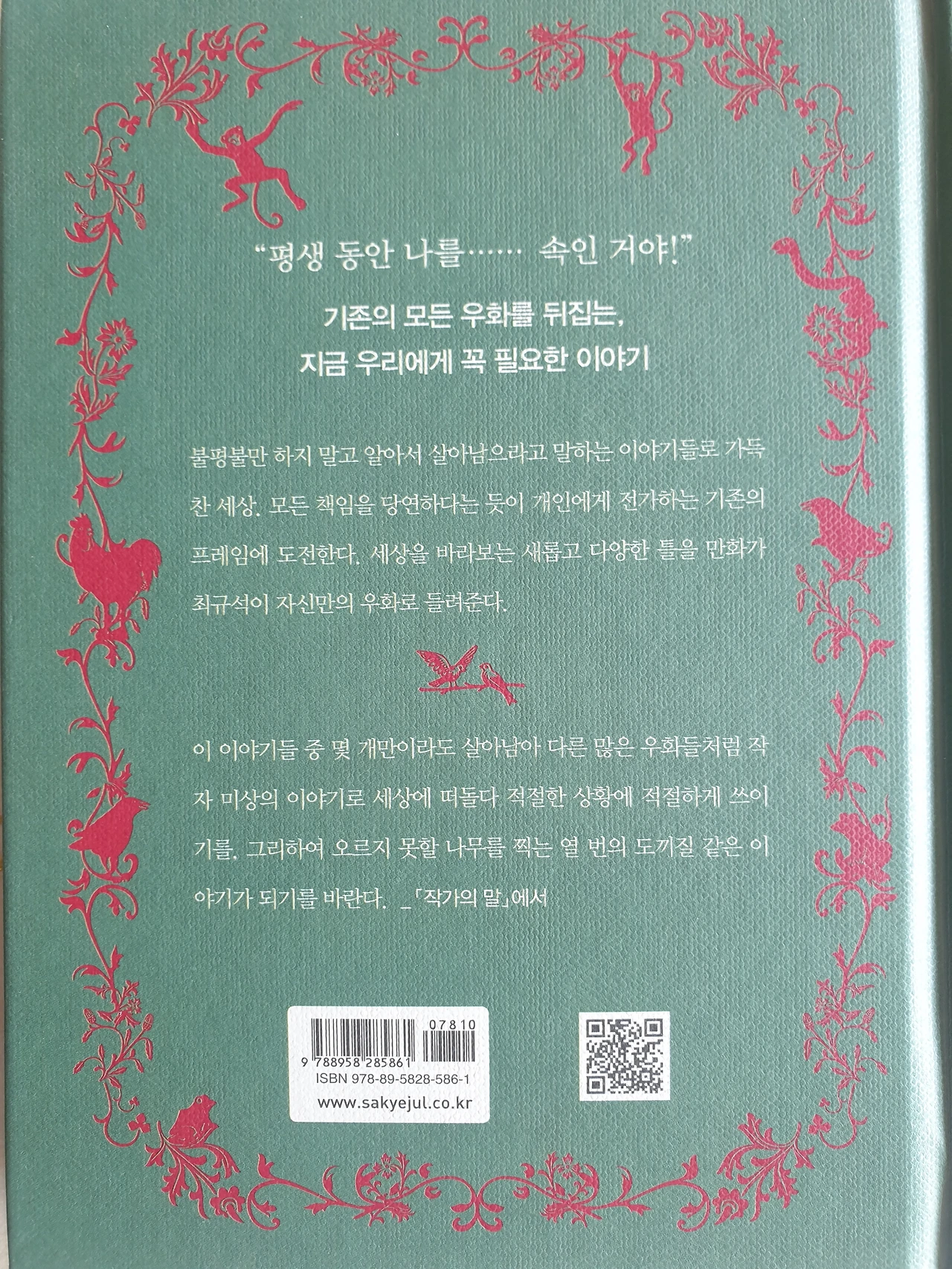 단편적인 생각으로 결론을 짓고 그것이 옳다고 주장하는 '라떼'스럽고 '꼰대'스러운 생각들을 전환하라는 메시지가 담겨있습니다. 모두가 힘들고 어려운 일이 닥쳤을 때 "조금만 더 힘을 내!"라거나 "이 시기를 거치면 반드시 성장할 거야!"라고 이야기할 때 작가는 불평불만을 그냥 늘어놓으라고 전달하는 듯합니다. "힘든데 왜 견뎌?" , "슬픈데 왜 참아?"라고 하고 싶은 대로 하며 살라는 듯 툭툭 던져놓는 짧은 이야기는 읽은 후 더 많은 생각과 여운으로 다가옵니다.