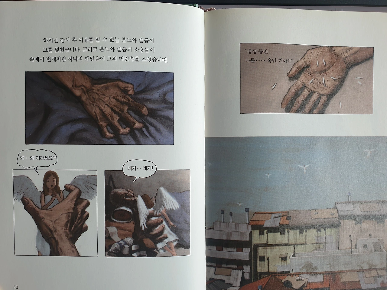 소년은 불행한 환경에서 살아갑니다. 힘들고 어려운 일이 있을 때마다 천사가 다가와 '조금만 더 힘을 내!'라고 응원합니다. '조금만 더 참으면 반드시 좋은 일이 있을 거야.'라고 말하는 천사의 위로에 소년은 힘을 냅니다. 그러나 소년은 죽음을 맞이하는 순간까지 불행했고, 참고 참은 세월이 야속했습니다. 임종을 앞둔 소년은 부당함에 맞서지 않고 억울한데도 당하며 참고 참아왔던 세월이 억울하고 참담했습니다. 결국 천사와 함께 죽음을 맞이하며 소리칩니다. "네가 나를 평생... 속인 거야!"