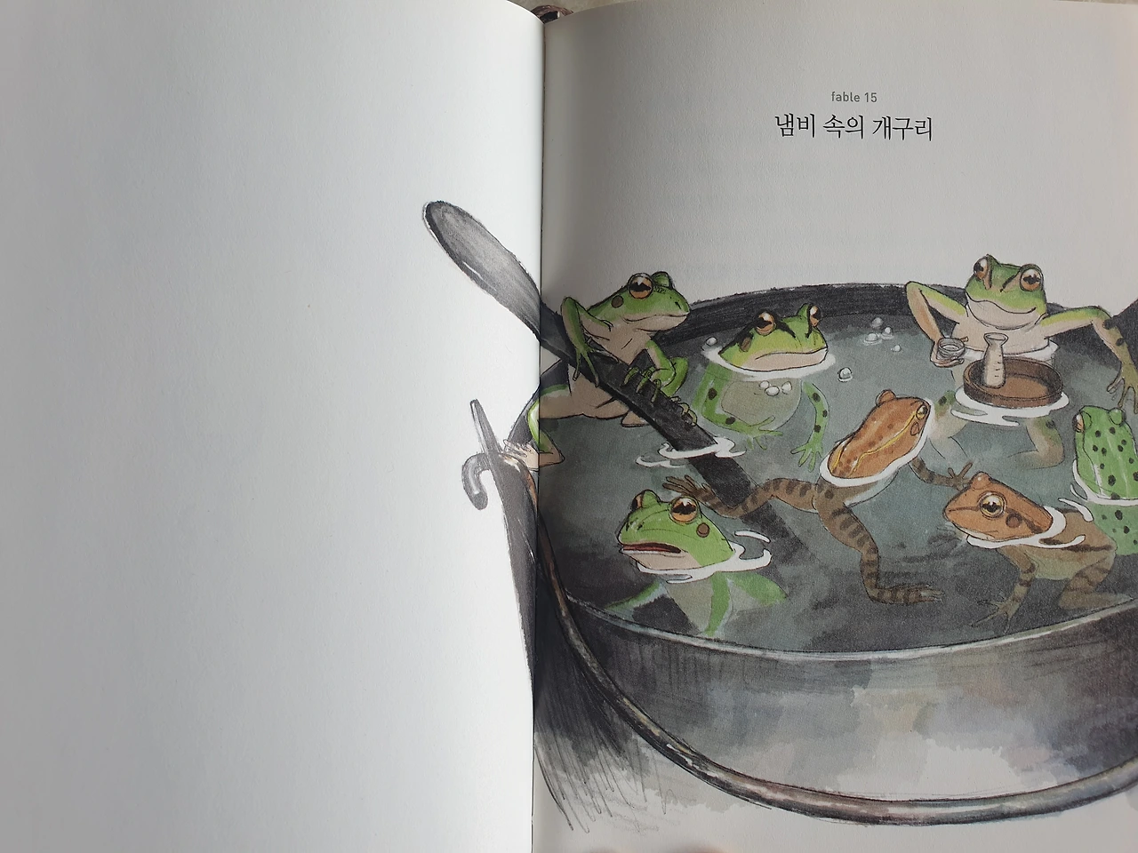 냄비 속의 개구리들은 천천히 달아오르는 냄비 속에서 우왕좌왕합니다. 어느 한 예민한 개구리가 '냄비가 뜨거워지는데?'라며 의문을 제기합니다. 그러나 잘난 척하는 개구리가 '다른 냄비는 없어! 설령 있다 해도 그곳이 여기보다 더 나을 거라는 걸 어떻게 알 수 있니?'라며 설득합니다. 의견을 내지 못하는 다른 개구리들은 이상하지만 머물러 있습니다. 그러나 예민한 개구리는 뛰쳐나오며 '바보들아! 뜨거운 것은 그냥 뜨거운 거야!'라고 소리칩니다.