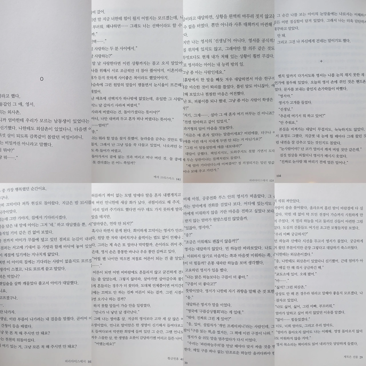 자신에게 처한 현실이 너무 비참해서 억지로 철들게 된 주인공 '영서'는 참고 견디는 게 더 익숙한 아이입니다. 중학생 소녀가 견디기에는 너무나 버거운 현실이었지만, 영서는 자신을 버린 부모도, 자신을 둘러싼 차가운 현실도 원망하지 않고 자신만의 파라다이스를 꿈꾸는 소녀였습니다.