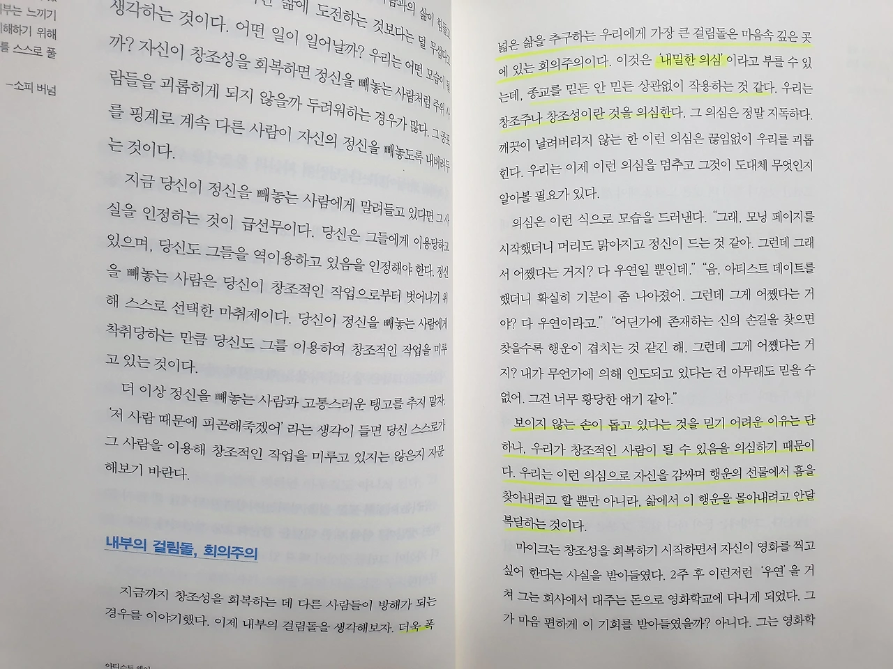 창조성 회복 과정에서 주목해야 할 것은, 우리의 새롭고 방대한 계획을 우주가 도와줄 수 있다는 가능성을 믿지 않고 오히려 이에 저항하게 된다는 점이다.