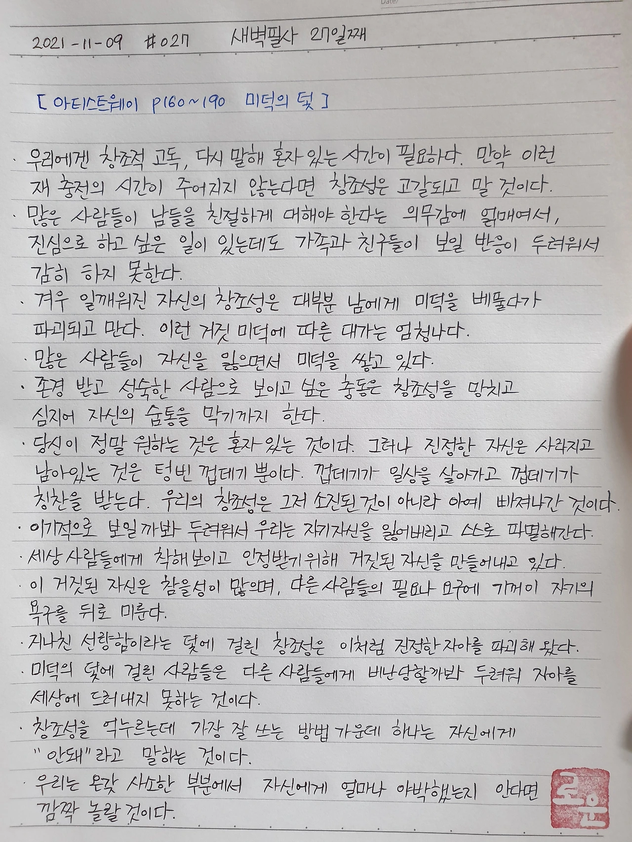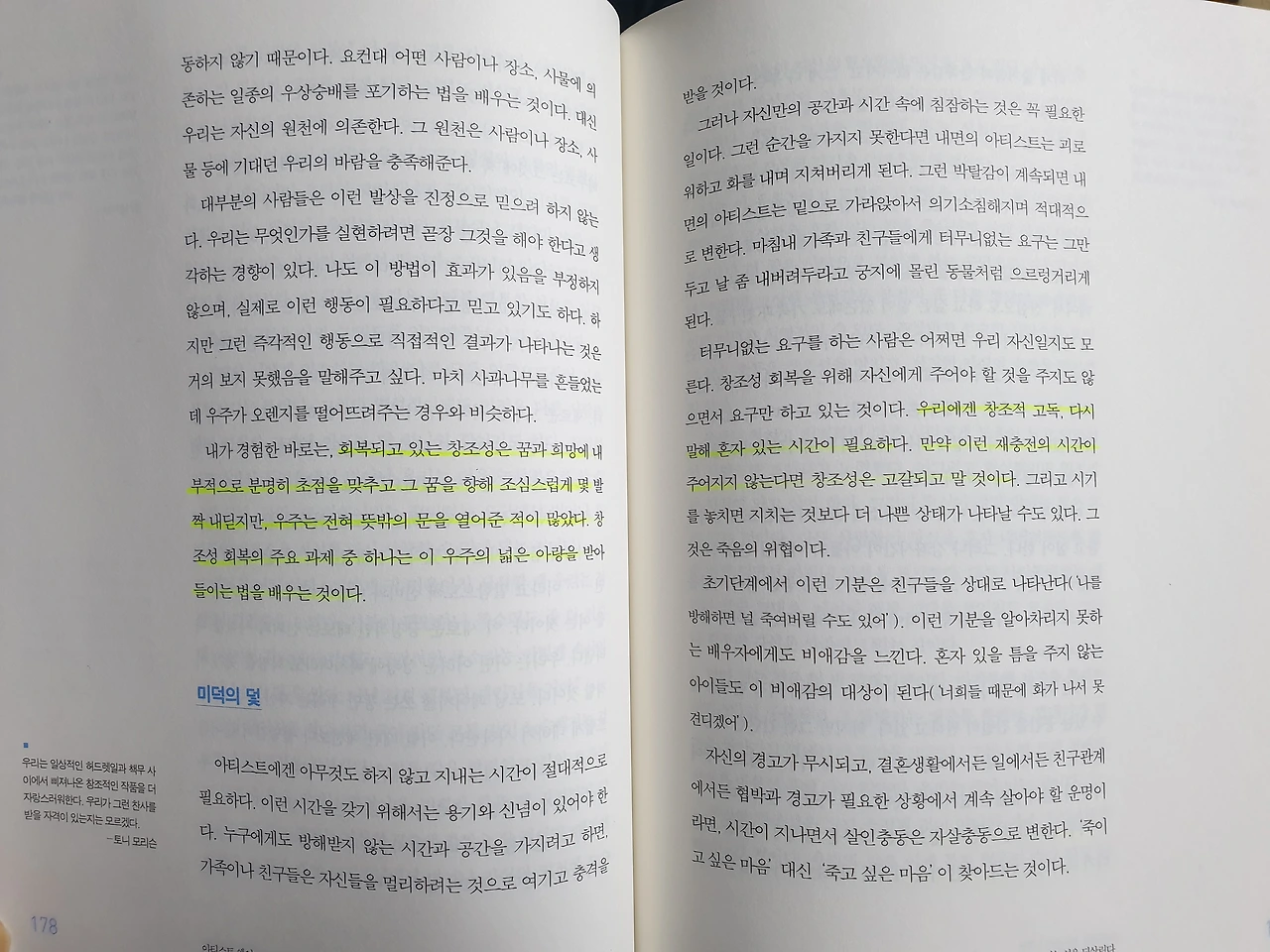 우리에겐 창조적 고독, 다시 말해 혼자 있는 시간이 필요하다. 만약 이런 재충전의 시간이 주어지지 않다는 다면 창조성은 고갈되고 말 것이다.