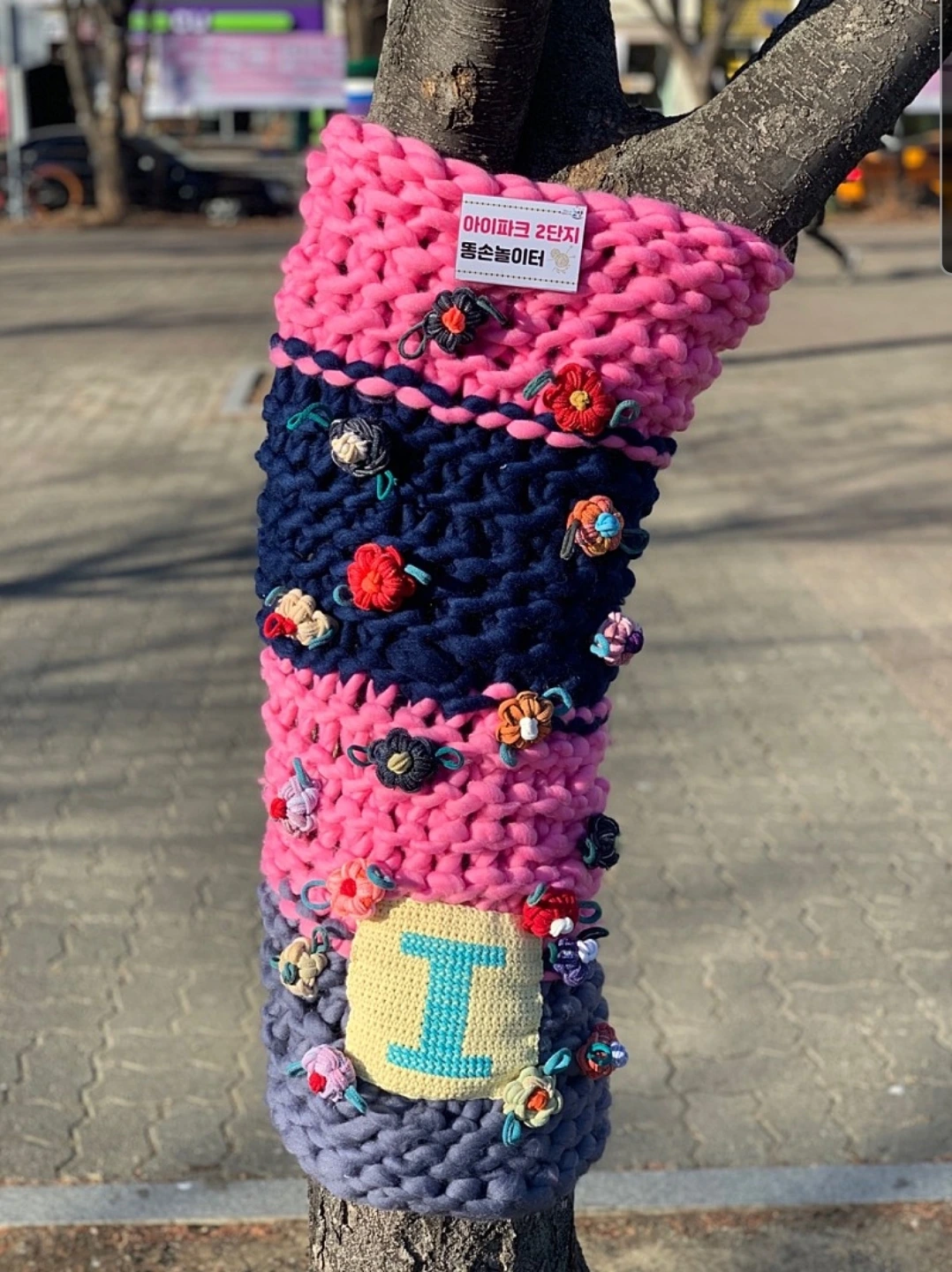 트리 니팅은 솜씨가 없어도 할 수 있습니다. 저처럼 뜨개질로 만들어도 되지만, 잘 입지 않는 뜨개옷이나, 목도리, 워머 등을 반듯하게 잘라서 나무에 둘러 꿰매어 주면 됩니다. 나무마다 옷이 달라도 소재가 같기 때문에 크리스마스트리를 한 듯한 아름다움으로 도시 미관을 어여쁘게 장식해 줄 수 있을 것 같습니다.