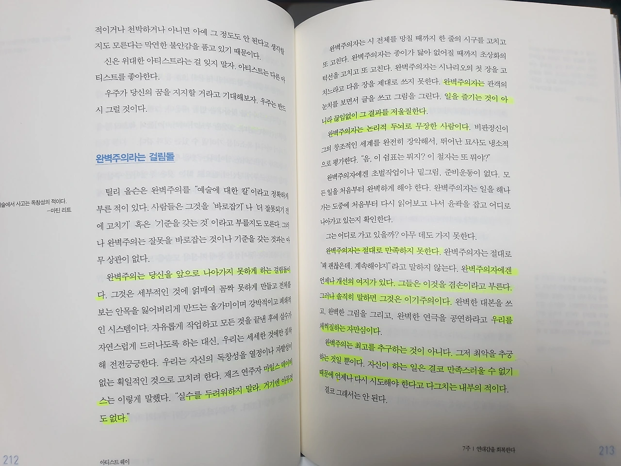 • 완벽주의는 최고를 추구하는 것이 아니라 최악을 추궁하는 것일 뿐이다. 자신이 하는 일은 결코 만족스러울 수 없기 때문에 언제나 다시 시도해야 한다고 다그치는 내부의 적이다.