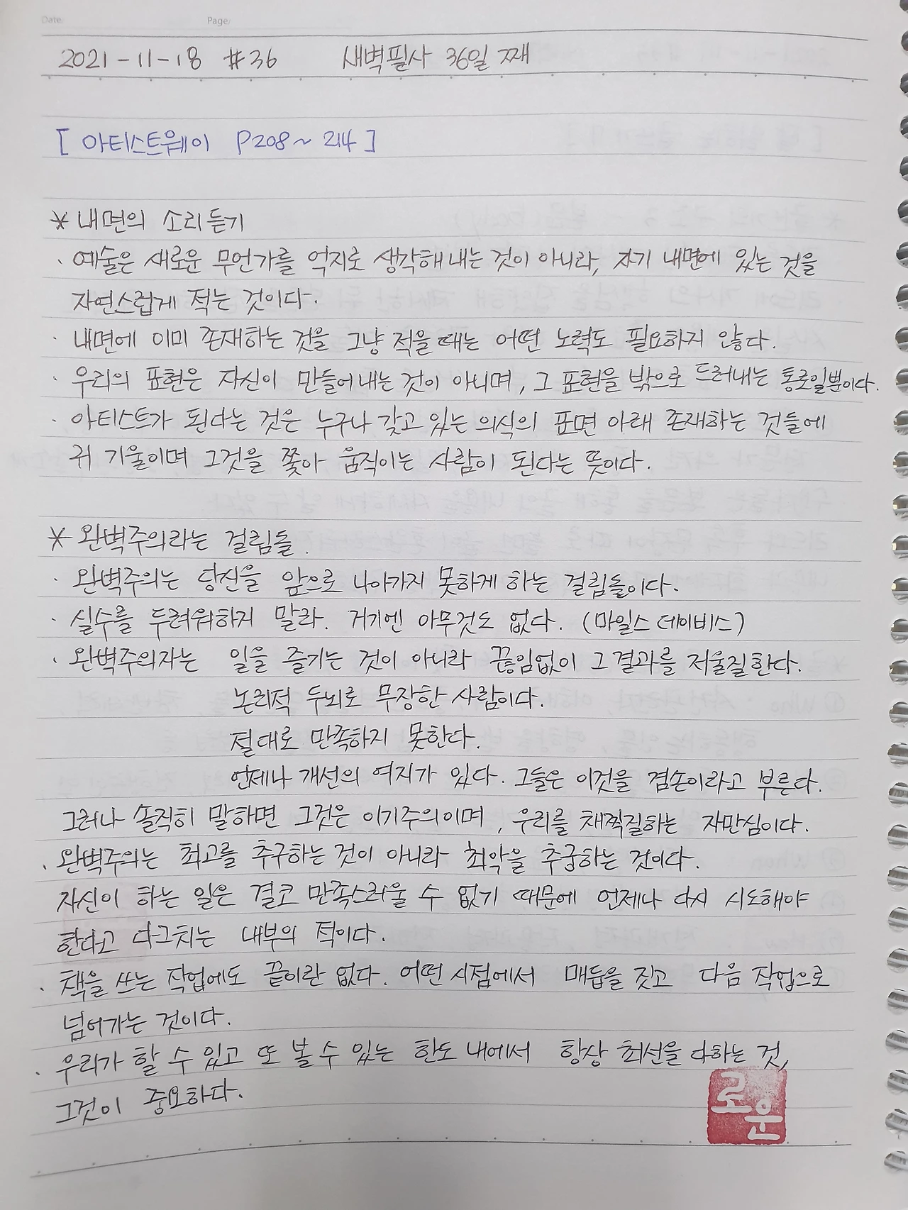 할 수 없는 부분까지, 젖 먹던 힘까지 짜내어하려 했던 나에게 깨우침을 주었습니다. 만족하지 못하고 나아가지도 못하게 스스로를 다그치기만 했던 나를 돌아보는 귀한 시간이 되었습니다. 오늘의 하루는 조금 더 넉넉한 시각으로 자신을 보듬어봐야겠습니다.