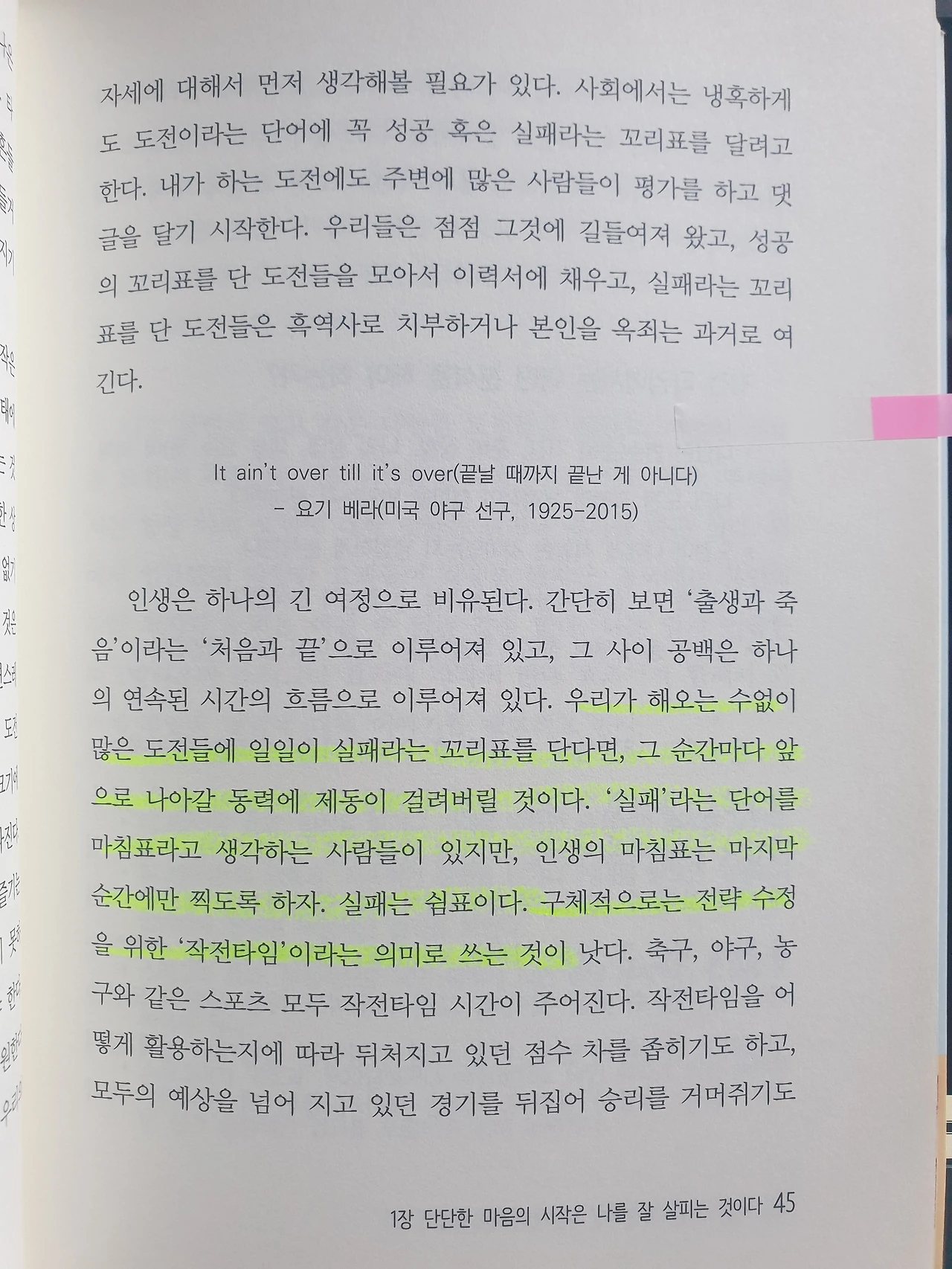 • 우리가 해오는 수없이 많은 도전들에 일일이 실패라는 꼬리표를 단다면, 그 순간마다 앞으로 나아갈 동력에 제동이 걸려버릴 것이다. '실패'라는 단어를 마침표라고 생각하는 사람들이 있지만, 인생의 마침표는 마지막 순간에만 찍도록 하자. 실패는 쉼표이다. 구체적으로는 전략 수정을 위한 '작전타임'이라는 의미로 쓰는 것이 낫다. (중략) ※ 스스로 실패라고 규정하지 말자! (중략)어떠한 행동을 하더라도 경험이라는 귀중한 것을 얻는다. (중략) 우리는 도전을 통해 무엇인가를 얻고 있기 때문에 실패는 아닌 것이다.