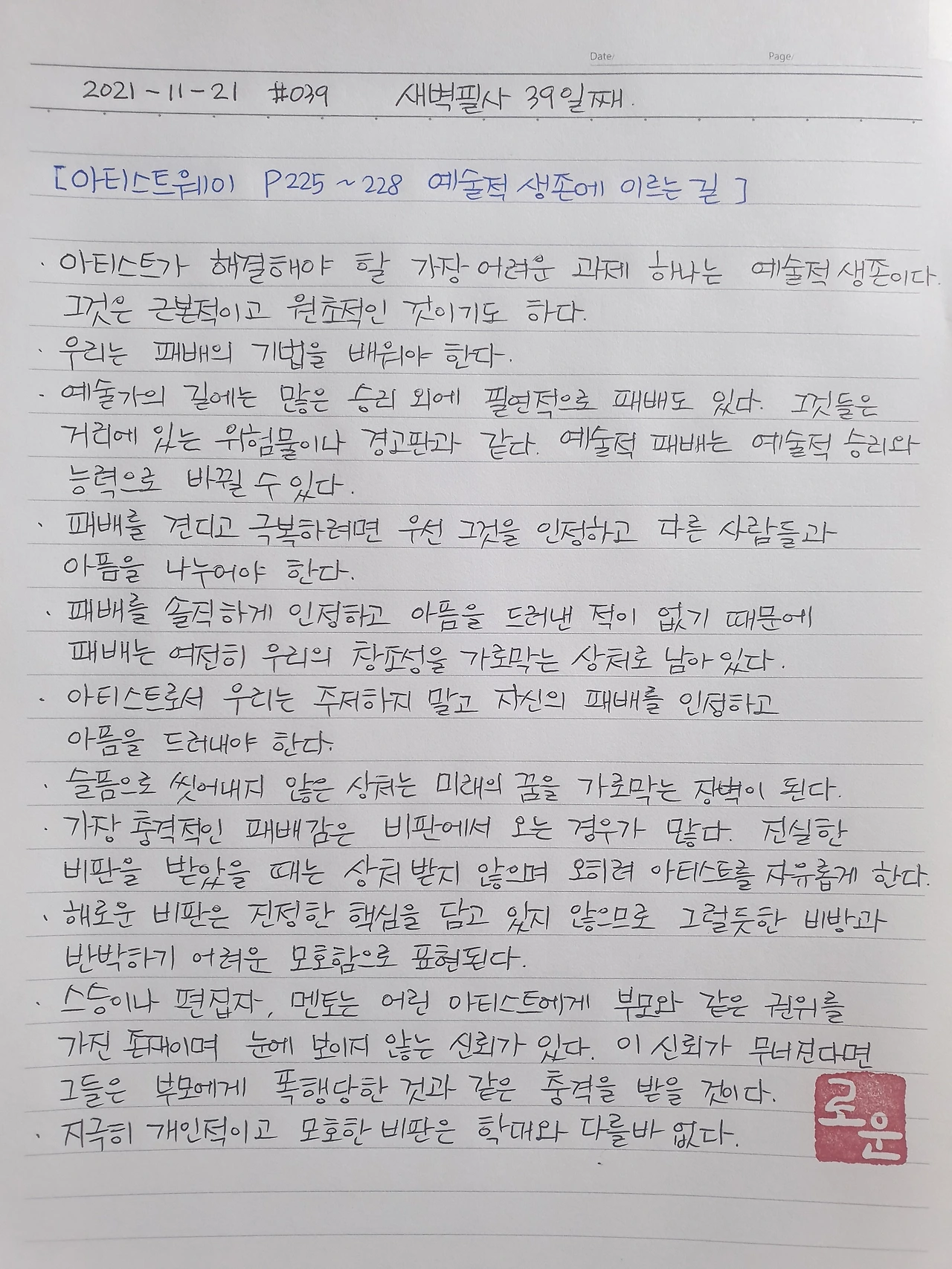 오늘의 명상은 [예술적 생존과 패배의 기법]에 관한 내용이었습니다. 그리고 함께 나누고픈 글은 [실패는 쉼표]입니다.