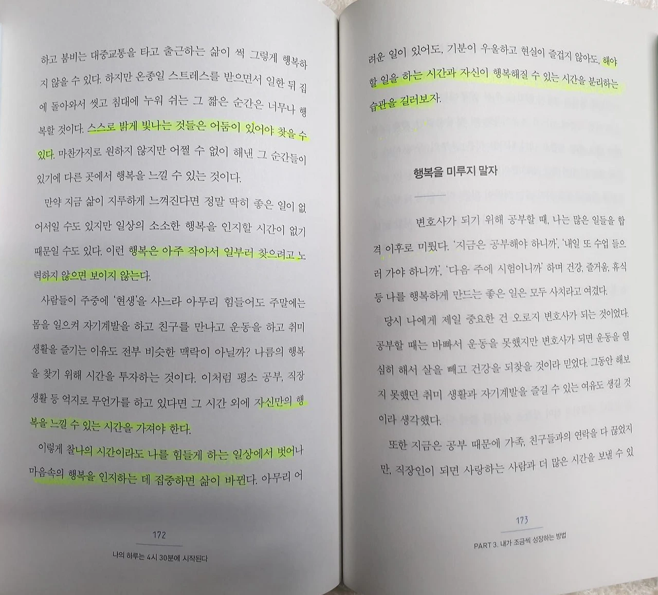 지금은 하기 싫은 일도 해보고, 어쩔 수 없이 해야 하는 일도 겪어봐야 진정한 행복을 느낄 수 있다. 스스로 밝게 빛나는 것들은 어둠이 있어야 찾을 수 있다. 행복은 아주 작아서 일부러 찾으려고 노력하지 않으면 보이지 않는다. 자신만의 행복을 느낄 수 있는 시간을 가져야 한다. 찰나의 시간이라도 나를 힘들게 하는 일상에서 벗어나 마음속의 행복을 인지하는 데 집중하면 삶이 바뀐다. 해야 할 일을 하는 시간과 자신이 행복해질 수 있는 시간을 분리하는 습관을 길러보자.