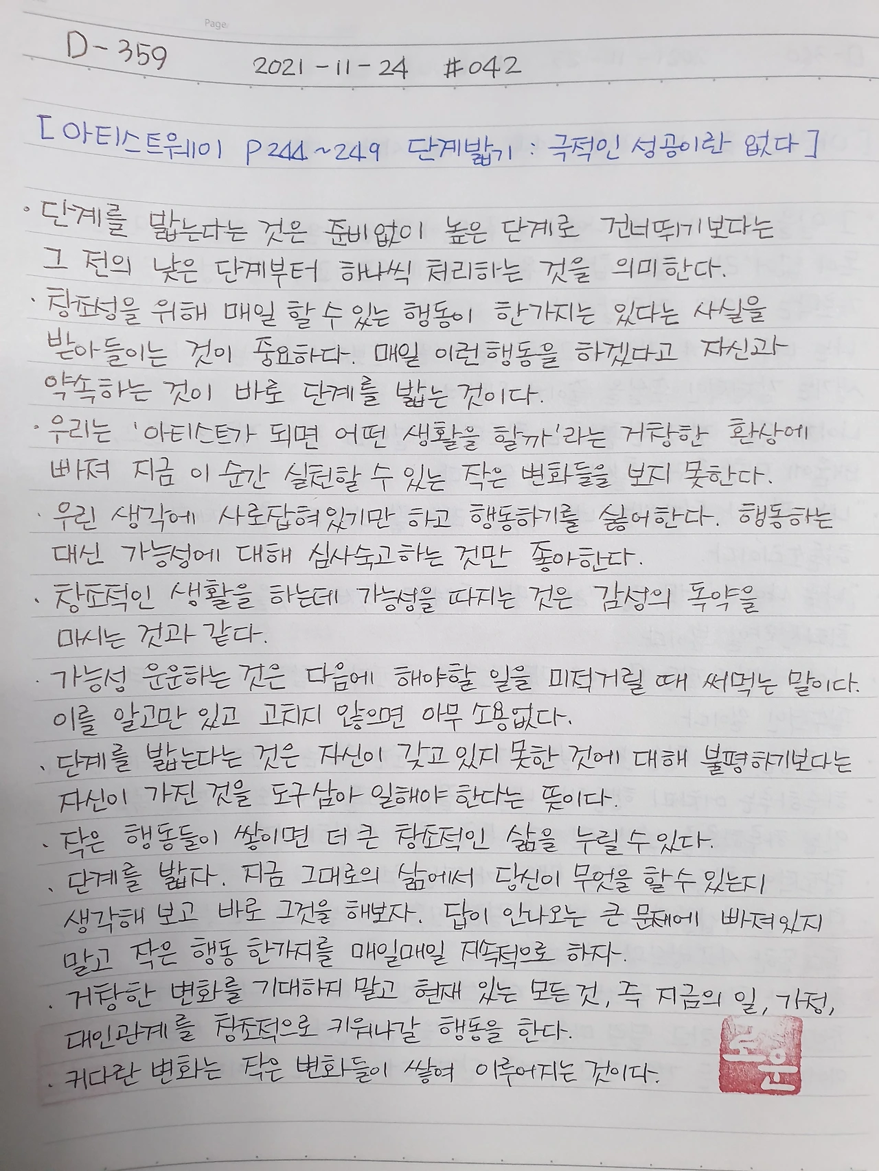 • '왜 이렇게 글이 제대로 써지지 않을까'라는 생각이 들 때도 있겠지만, 그런 생각은 나중 문제이고 지금은 다음 순서의 일로 나아가는 것이 중요하다. 여기서는 매일 써야 할 분량을 써내는 것이 단계를 밟는 것이다.