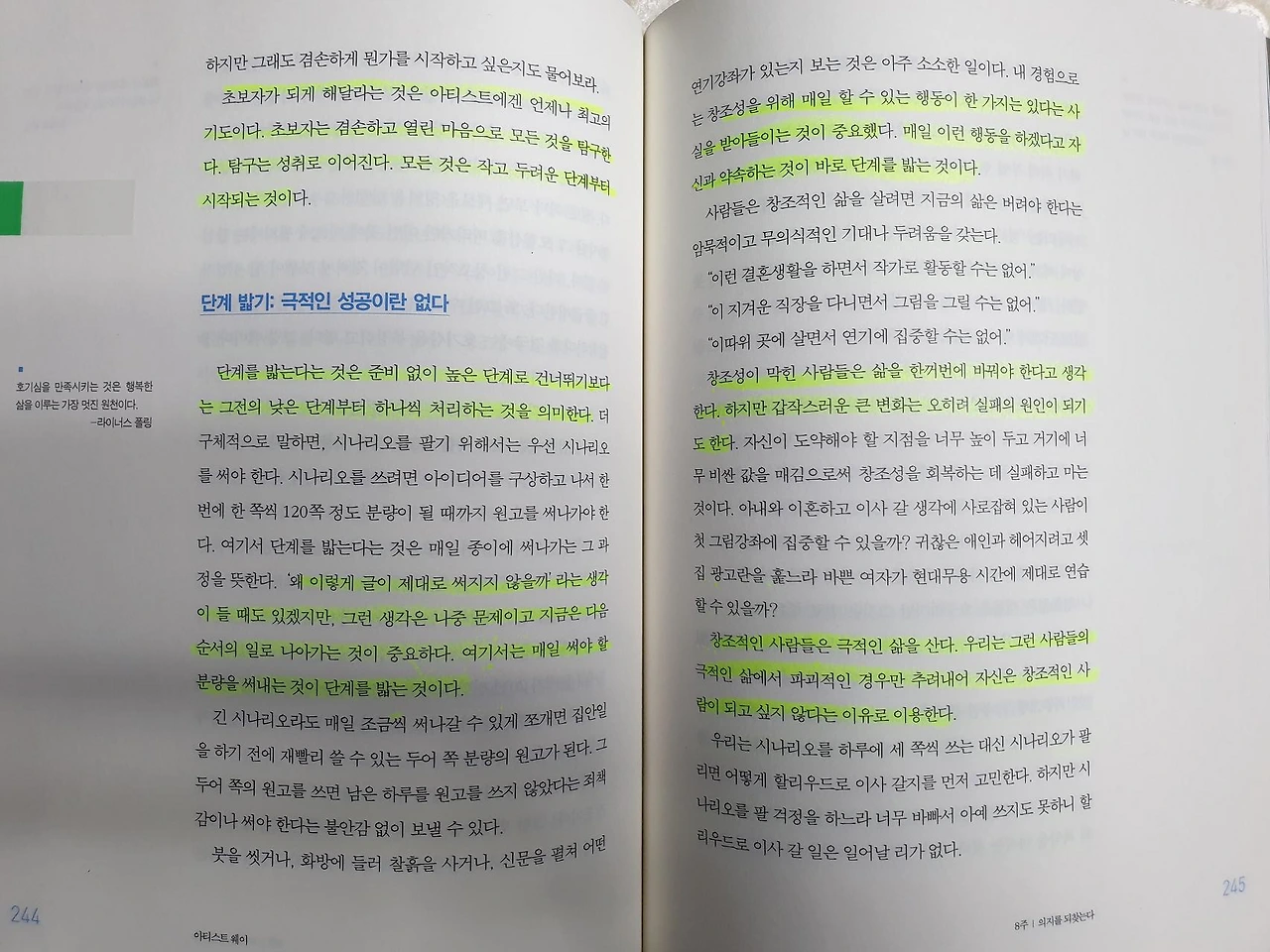 • 창조성이 막힌 사람들은 삶을 한꺼번에 바꿔야 한다고 생각한다. 하지만 갑작스러운 큰 변화는 오히려 실패의 원인이 되기도 한다.
