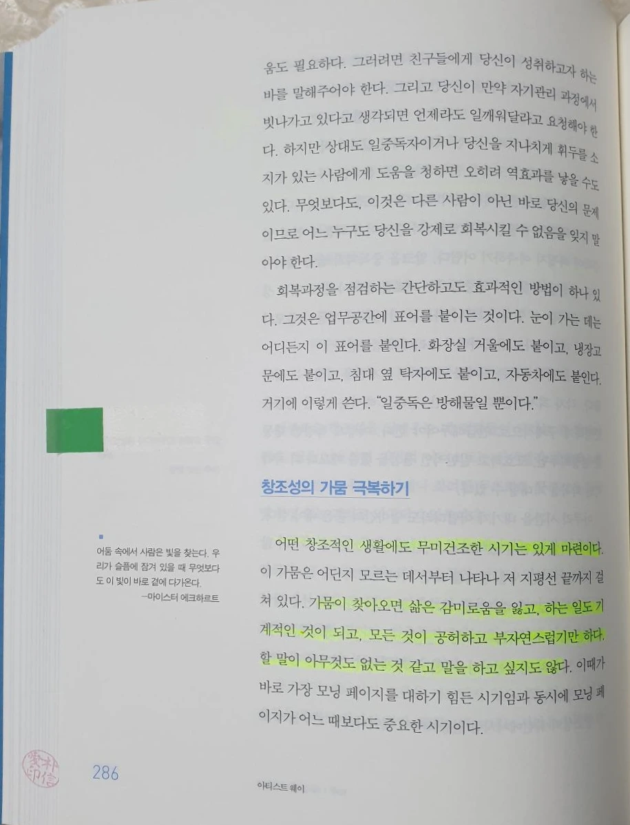 창조성의 가뭄은, 때때로 감정에 기복이 생기고, 의욕이 떨어지며, 여러 가지 상처로 아픈 시기를 겪는 과정을 이야기합니다. 남의 일일 때는 쉽게 '어서 툴툴 털고 일어나라!'라고 할 수 있겠지만, 내 문제가 되었을 때는 아프고, 버겁고, 힘들 수 있습니다. 그래도 힘을 내서 우뚝 서면 또 한 계단 성장한 나와 마주하게 되는 것이죠.