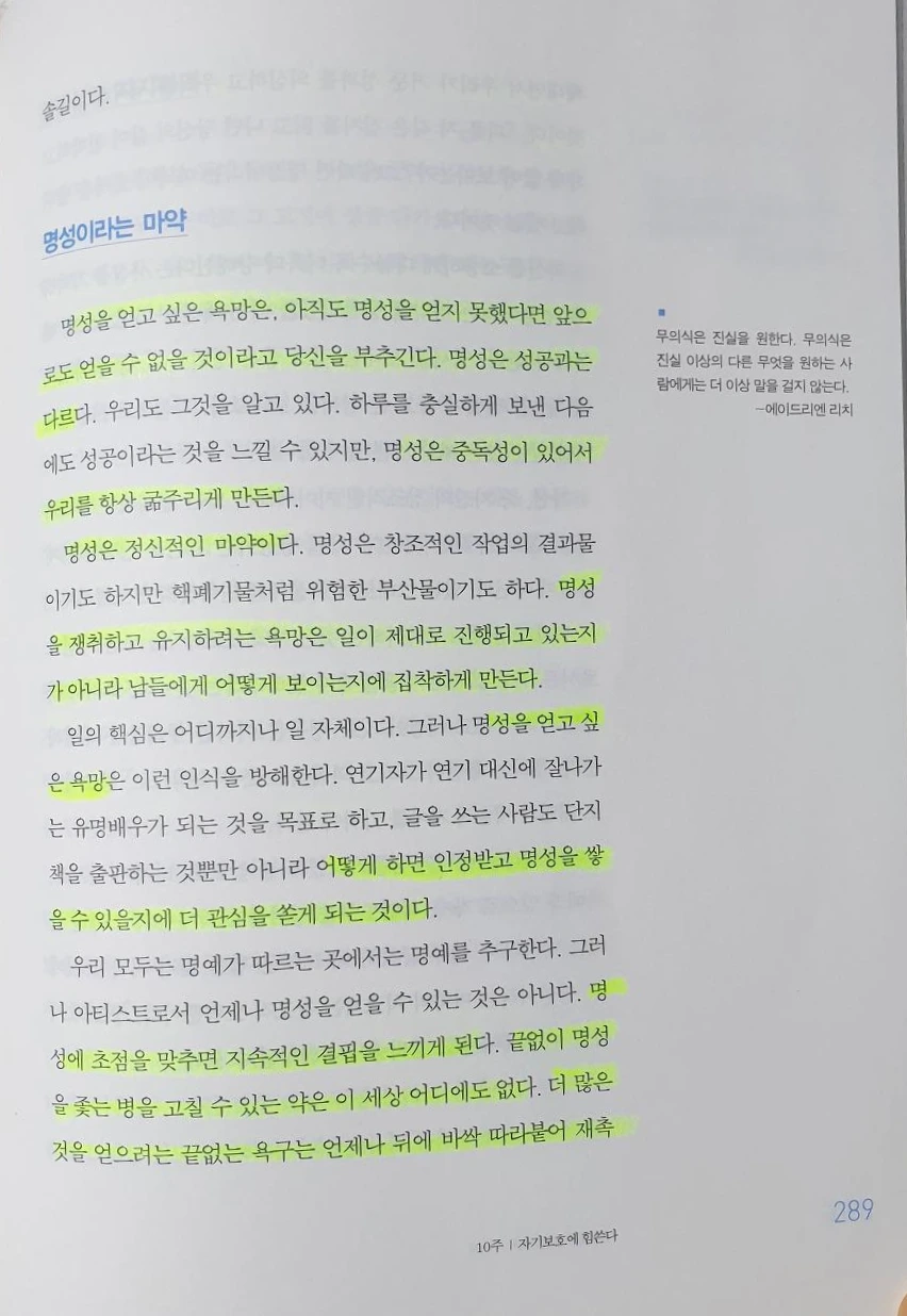 • 명성을 얻고 싶은 욕망은, '아직도 명성을 얻지 못했다면 앞으로도 얻을 수 없을 것'이라고 당신을 부추긴다. 명성은 성공과는 다르다.