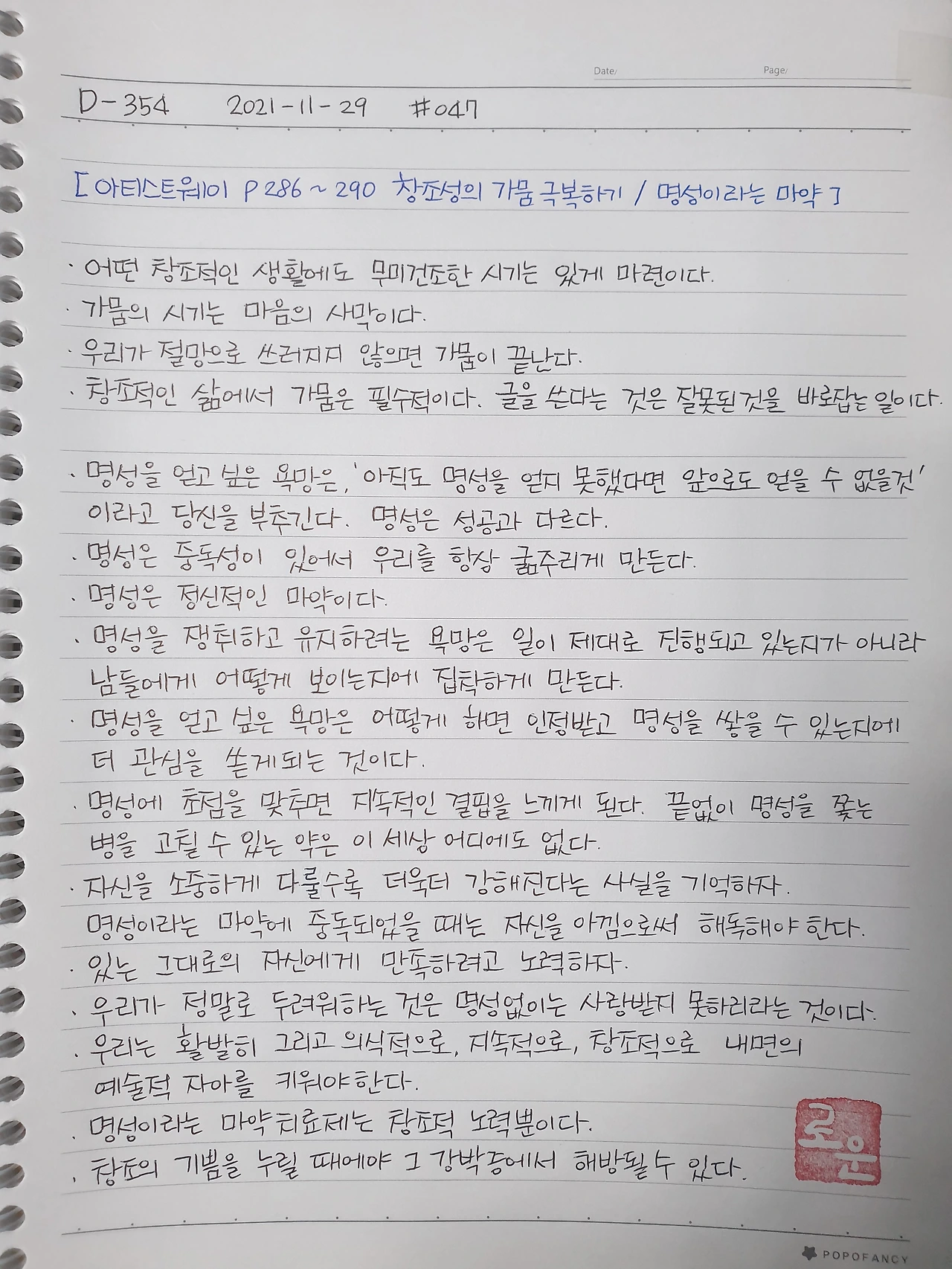 보이든 보이지 않든, 내가 쓴 글에 부끄럽지 않고, 읽어 주시는 독자들이 허탈하지 않은 글을 쓰기 위해 마음을 모으겠습니다. 순서대로 읽고 있는 아티스트 웨이가 시기적절하게 깨달음의 메시지를 던져줍니다. 명상을 하며 대면하는 하루는 신기합니다. 그리고 치우치지 않도록 깨달음을 주심에 감사합니다. 매일 "함께 가는 길"을 같이 걸어주셔서 진심으로 감사드립니다.
