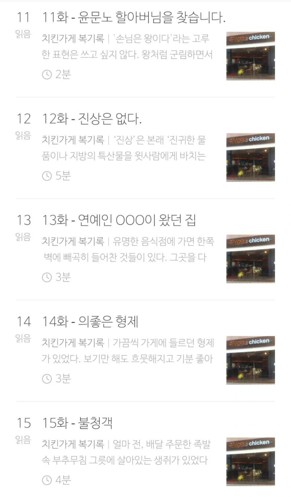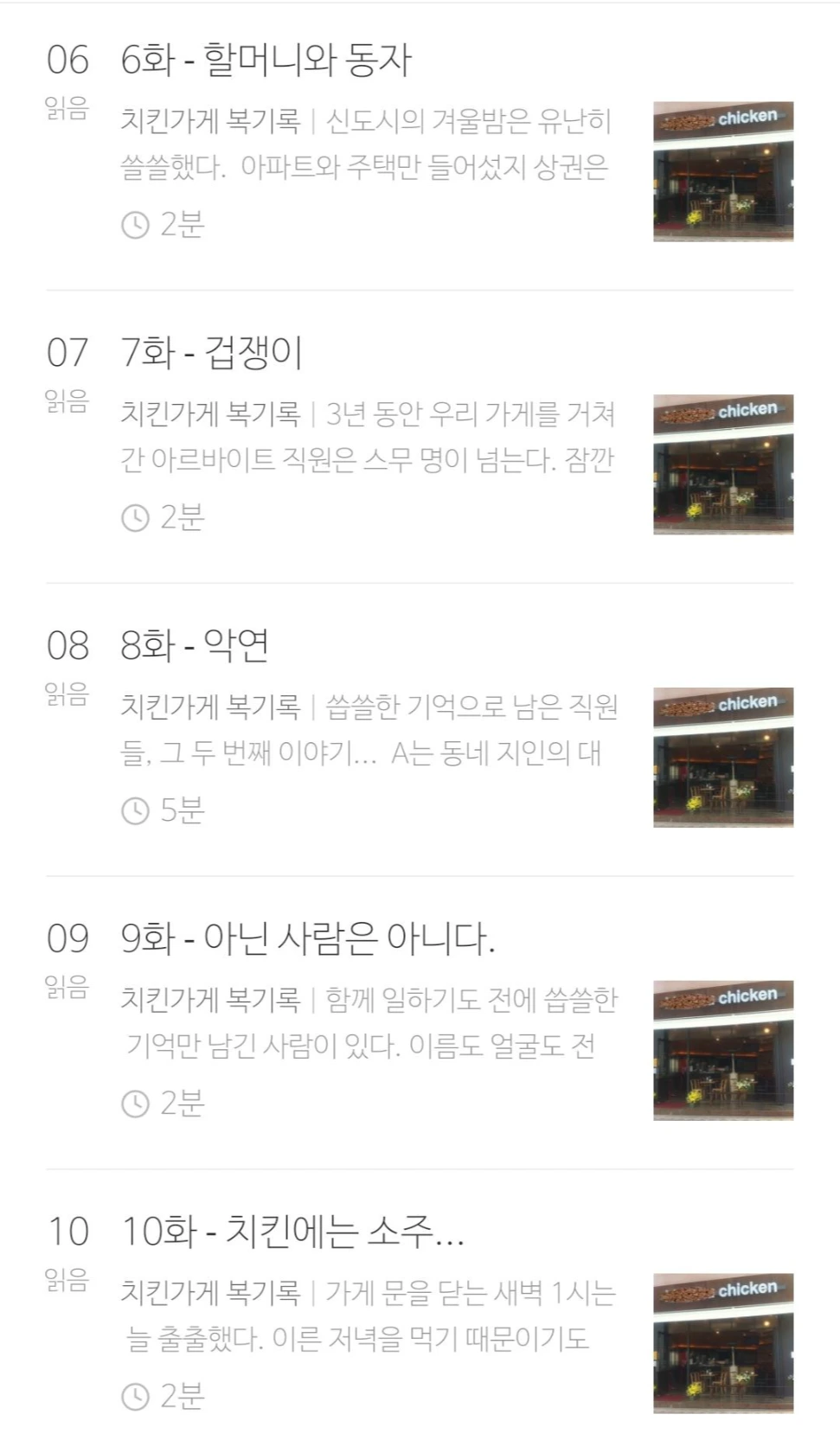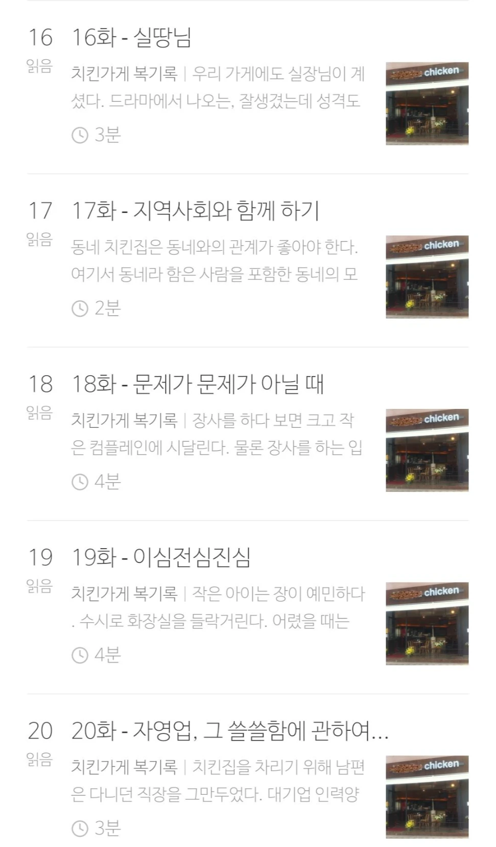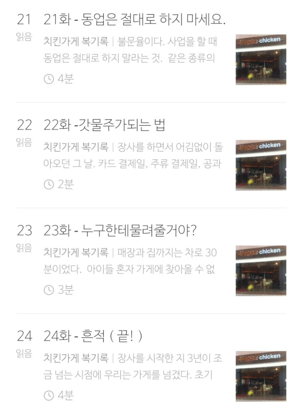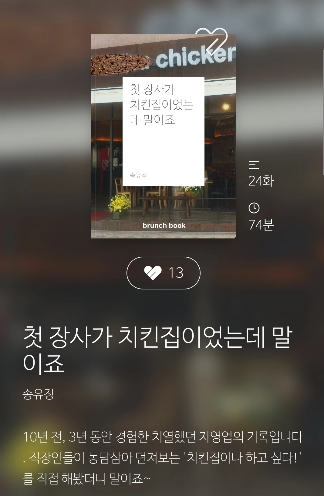 24편의 이야기로 창업부터 폐업까지의 이야기를 솔직하고 진솔하게 담아낸 송유정 작가의 [첫 장사가 치킨집이었는데 말이죠]에서는 누구나 한번쯤 생각해 봄직한 자영업의 꿈이, 정말 꿈이지 현실은 녹록지 않다는 것을 보여줍니다. '하루하루는 어렵고 힘든 시간들이었지만 지나고 나니 추억이더라.'라고 한 마디로 정의하기에 자영업 창업은 그리 만만치가 않습니다. 작가가 세상을 보는 시선과 힘든 시간도 추억으로 만드는 긍정적인 마음씀이 고스란히 느껴지는 브런치 북을 여러분도 함께 읽어보셨으면 좋겠습니다.