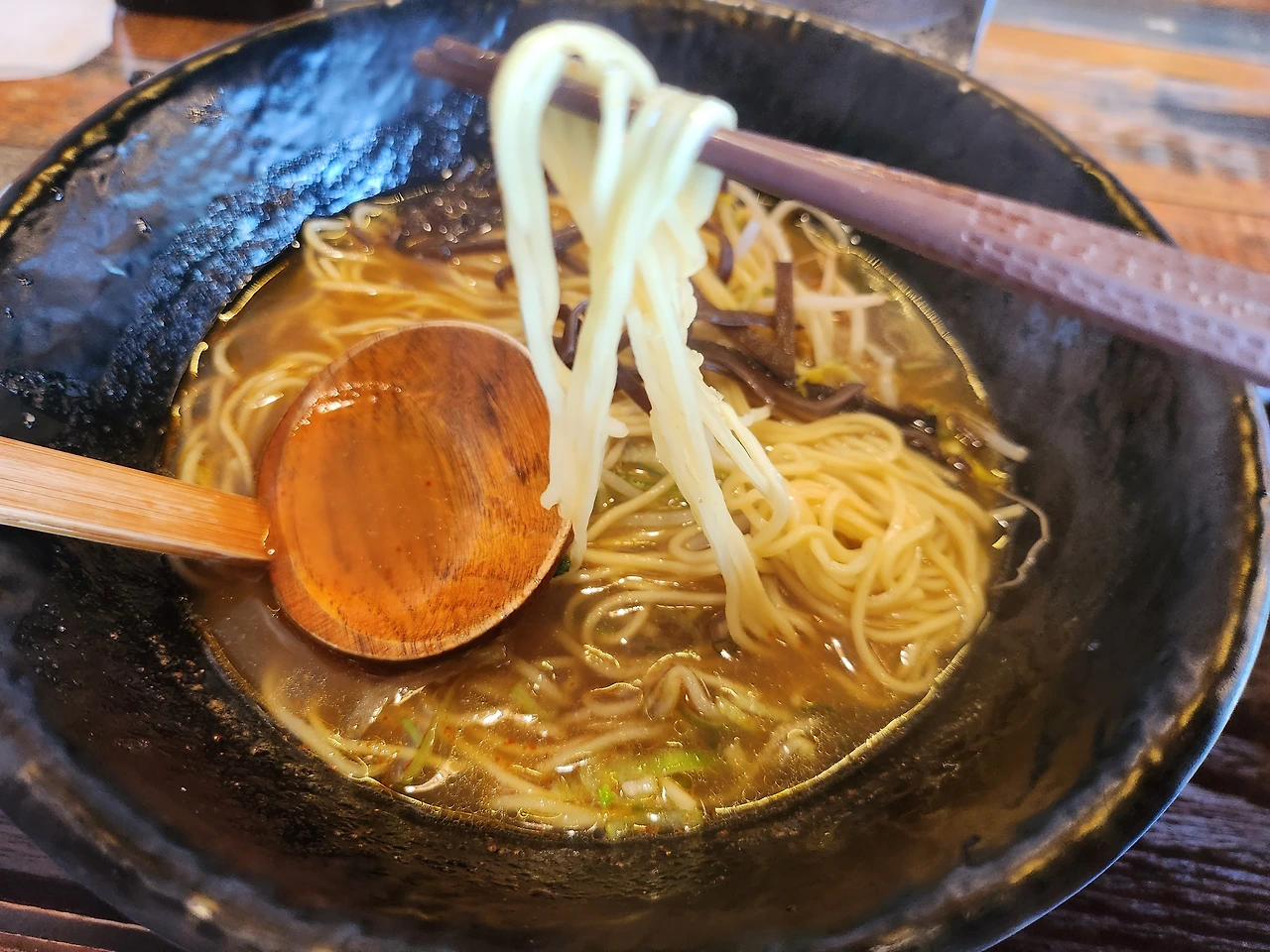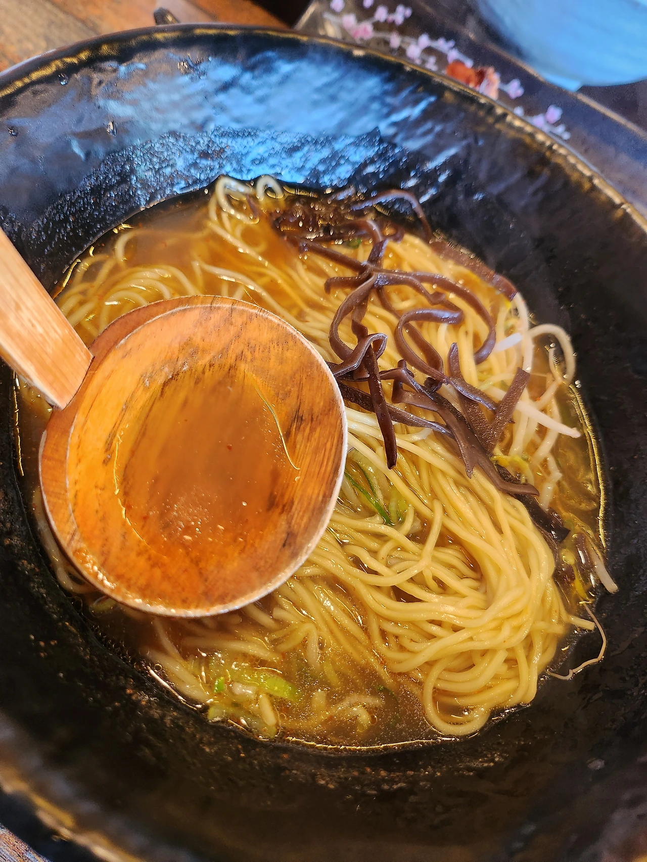라멘이 식탁 위에 놓인 후 사진 몇 장 찍어봅니다. 그리고, 신기하게 생긴 나무 숟가락을 보며 앵글이와 한바탕 숟가락 생김새를 놓고 되지도 않는 말장난 몇 마디를 주고받으며 국물 한 모금을 들이켜보았습니다. 국물 맛은 꽤 맛있습니다. 라멘 위에 얹어진 삼겹살 구이는 제 입맛이 아니었지만 아이들이 왜 좋아하는지는 알 것 같은 맛입니다.