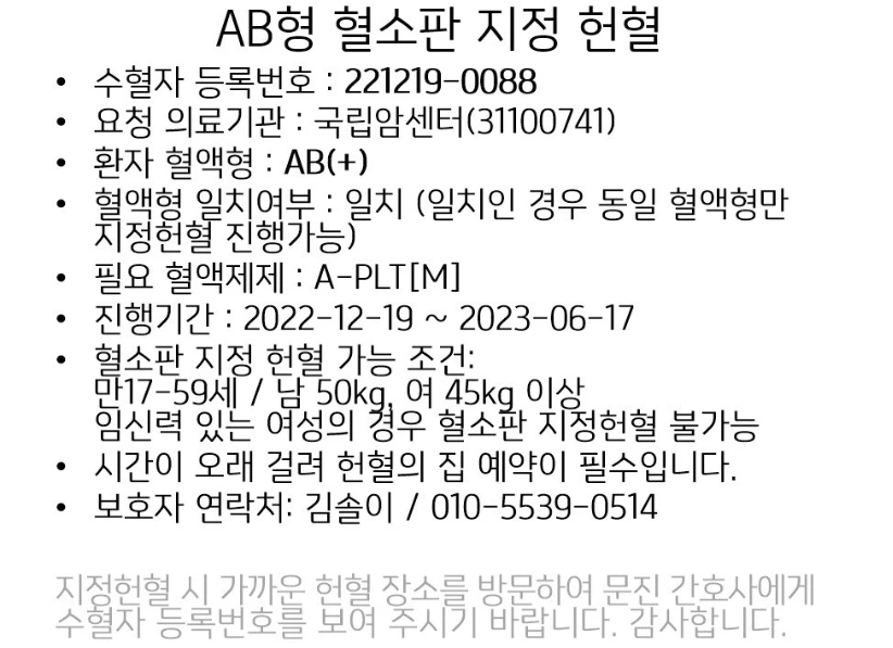지난 월요일에 인스타그램 스토리에 ab형 혈소판 지정 헌혈을 부탁하는 글을 올렸어요. 그동안은 저와 오빠와 동생의 1:1 교환 헌혈, 정말 운 좋고 고맙게도 남자친구의 ab형 지정 헌혈로도 충당이 되었는데 앞으로 2-3주 간은 매일 혈소판 수혈이 필요할 것 같다고 해서요.