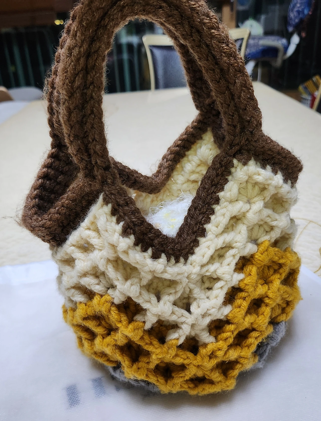 사실 전, 학교 다닐 때에도 가방을 잘 들고 다니지 않았어요. 청바지 뒷주머니에 카드 하나, 비상금 만원 정도 넣고 다녔죠. 직장을 다닐 때도 별반 다르지 않았어요. 짐을 들고 다니는 것을 좋아하지 않았고, 화장도 하지 않아서 파우치가 필요하지 않았거든요. 아이들 어릴 때는 어쩔 수 없이 가방을 들고 다녀야 해서 주로 배낭을 메고 다녔죠. 한쪽으로 메는 가방은 어깨끈이 자꾸 떨어져서 불편했거든요. 요즘에도 핸드폰과 동전지갑 하나면 충분해요. 자동차키와 카드 몇 개, 비상금 만원이면 족하거든요. 그래도 앵글이 가방을 만들고 남은 실로 제 것도 하나 만들었어요. 작은 손가방이 마음에 쏙 들었습니다.