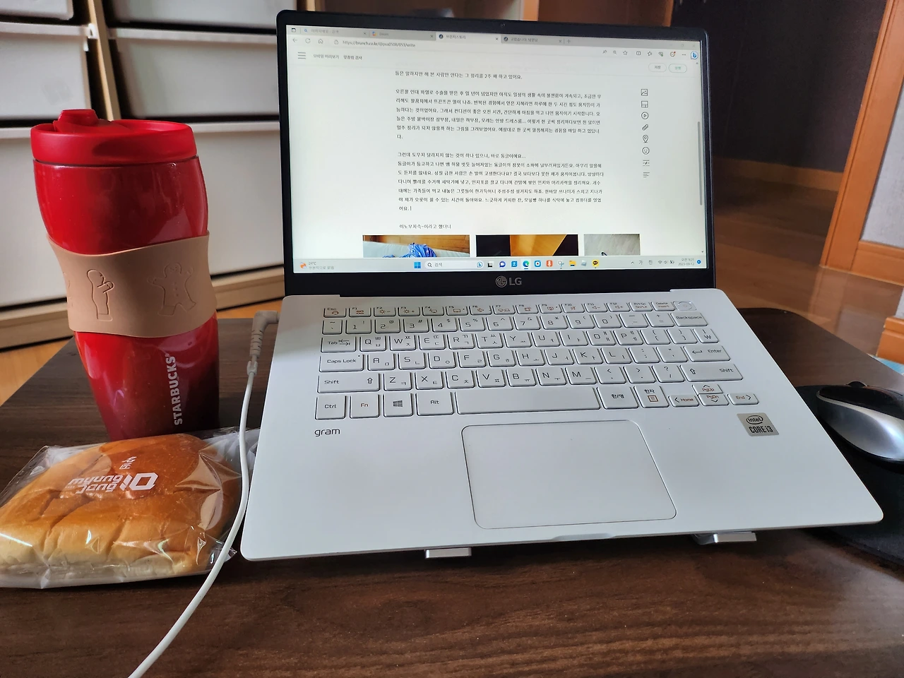 느긋하게 커피 한 잔, 모닝빵 하나를 식탁에 놓고 컴퓨터를 열었어요. 예쁜 컵과 단정하게 놓인 디저트 접시? 이런 건 없어요. 컵 하나도 나를 위해 설거지거리가 되는 것은 사절이죠. 오늘 종일 손에서 벗어나지 않을 것으로는 빨간색 텀블러 당첨이에요. 이것에 커피, 생수, 가끔 딸기에이드를 넣어서 마실 거고, 밤이 되면 애벌 설거지를 해서 자리끼도 담을 거예요. 온종일 텀블러 하나면 OK죠. 자신을 위해 너무 야박한 건 아닐까 생각할 수 있겠지만 효율성을 선택하게 되는 건, 컴 하나도 팔을 움직이게 하지 않으려는 나를 위한 배려라고 애써 변명을 해 봅니다.
