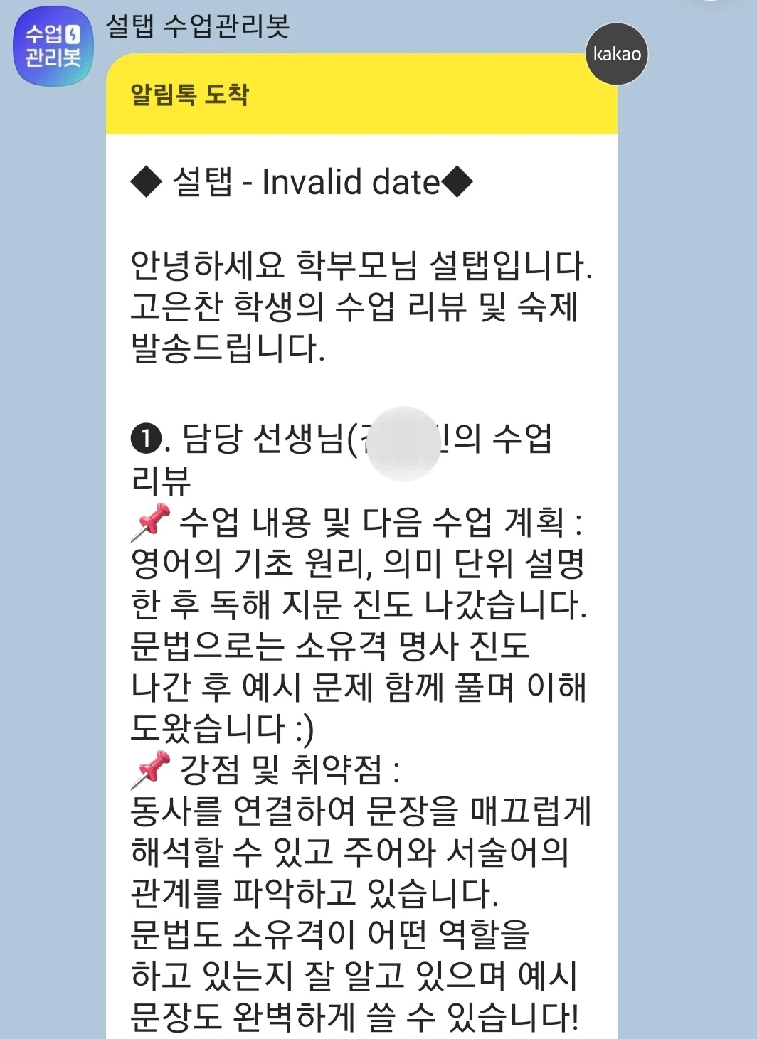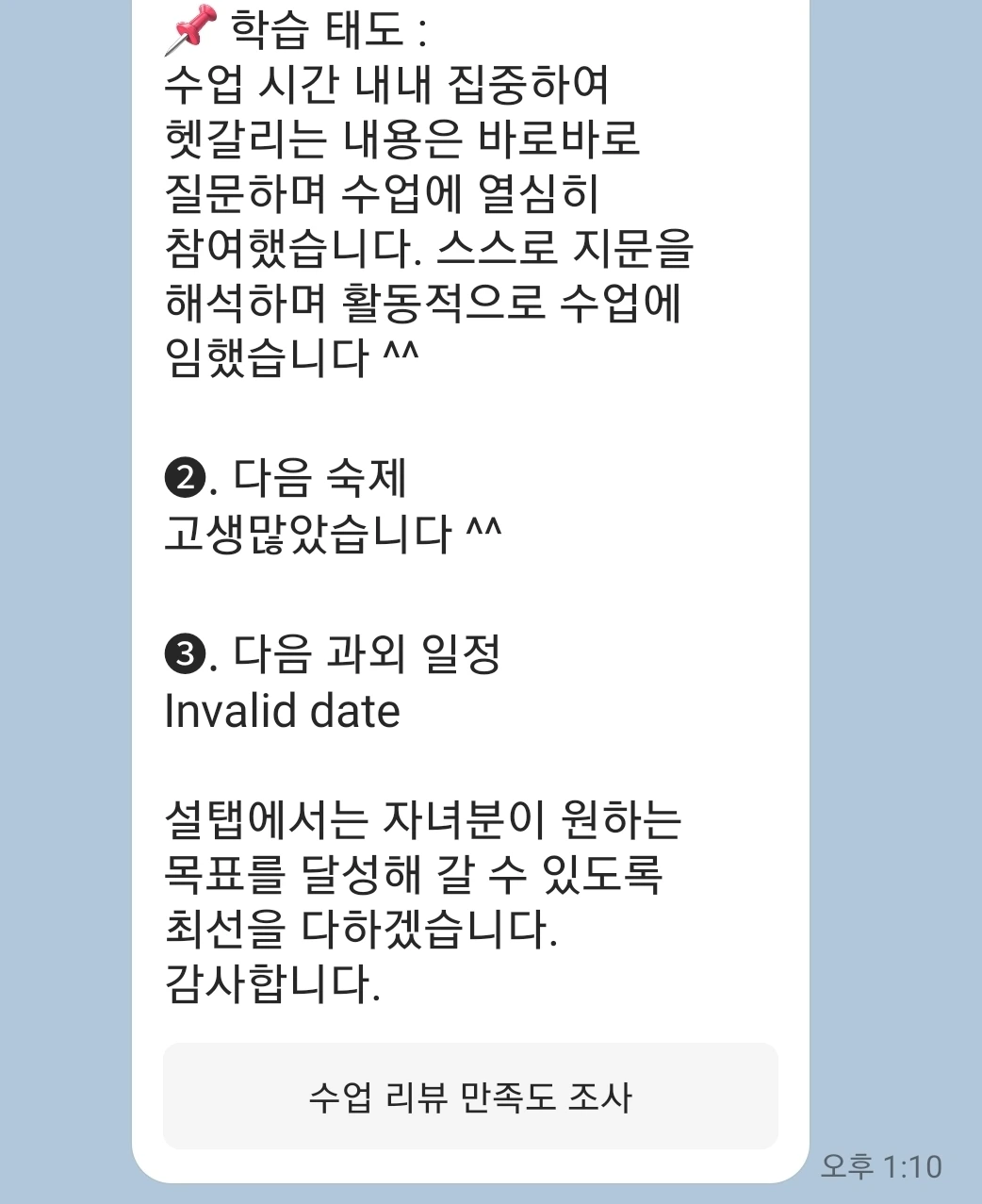 학원 수업은 일일이 전화 상담하지 않으면 그날그날 수업에 대한 피드백을 받기 어렵지만, 설탭은 매 수업을 마친 후 평가지를 보내주시니 그 또한 장점입니다. 사춘기에 접어든 아이들은 공부 관련된 질문에 답하려 하지 않으니 궁금해도 묻지 못할 때가 많습니다. 하지만, 선생님께서 수업 후 톡으로 피드백해 주시면 엄마의 궁금증도 해결되고 아이와 공부 관련한 대화를 줄일 수 있을 것 같습니다.