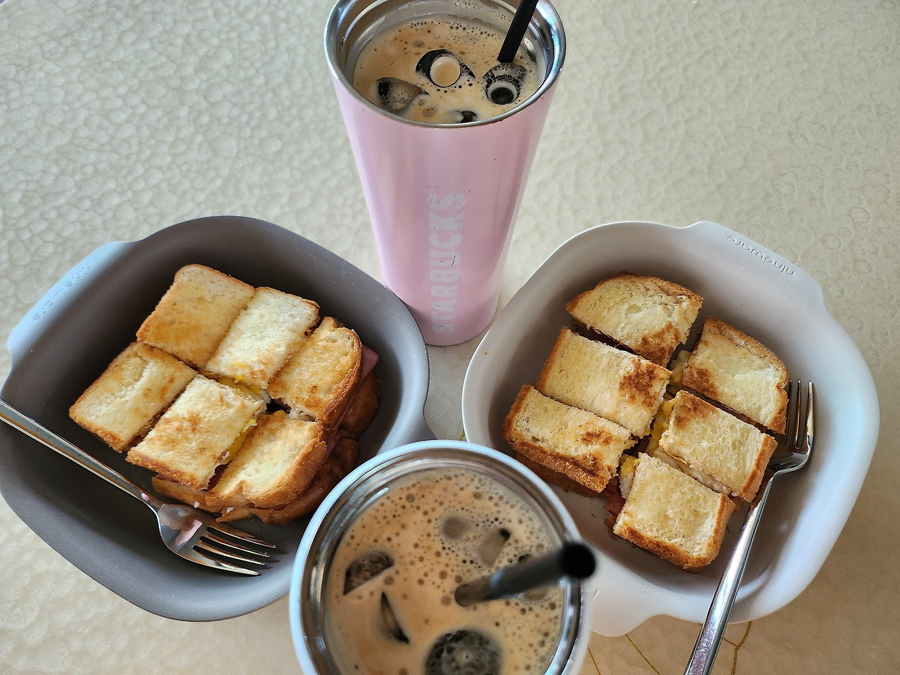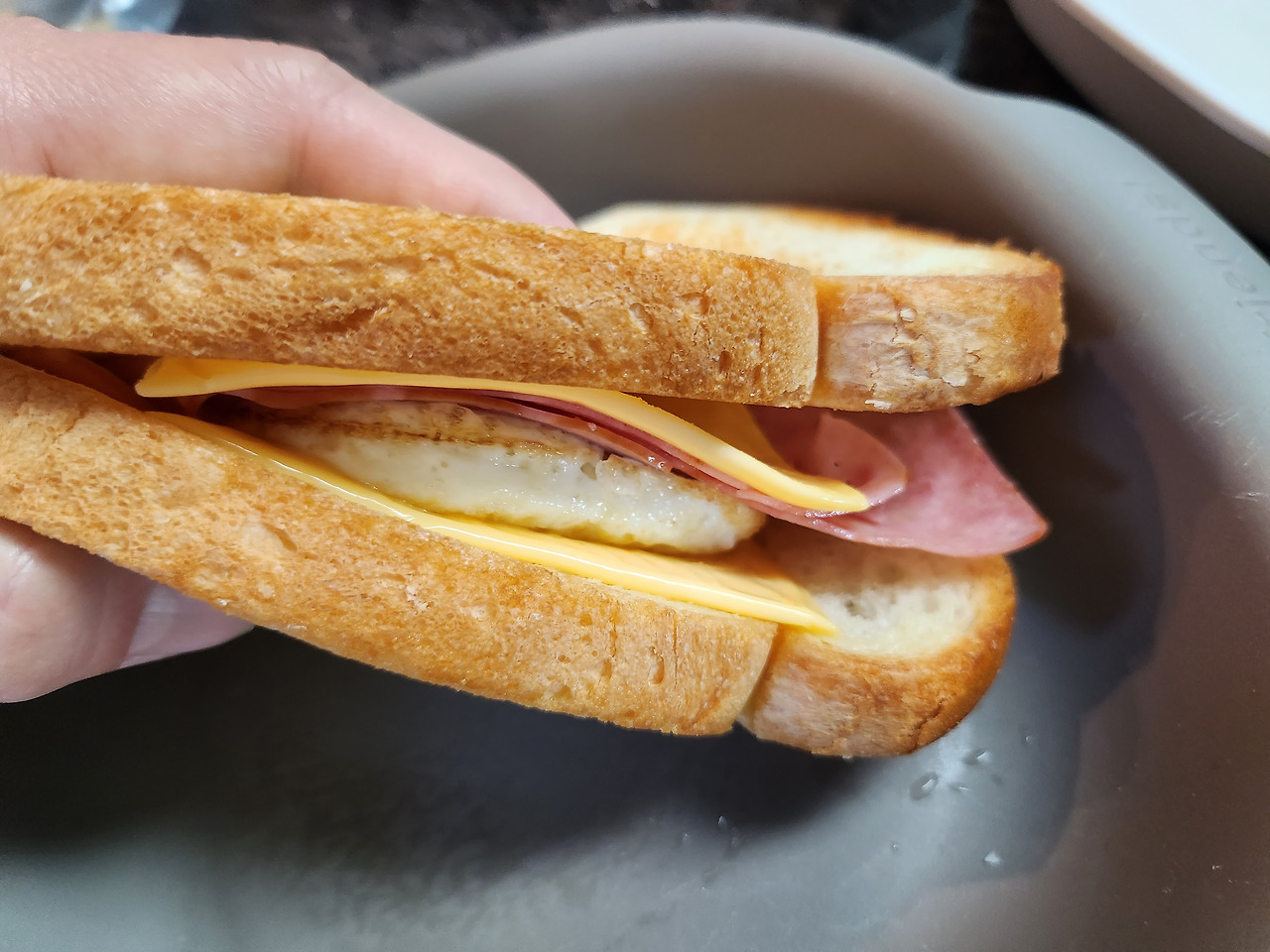 토스트기에 구워서 재료를 얹으면 조금 더 간편하지만 버터에 구워 만든 토스트가 훨씬 부드럽고 고소합니다. 간편하지만 자주 먹어도 물리지 않는 '햄치즈에그토스트'로 즐겁게 아침 식사 뚝딱 마치고 등교한 동글이가 즐거운 하루를 보내면 좋겠습니다.