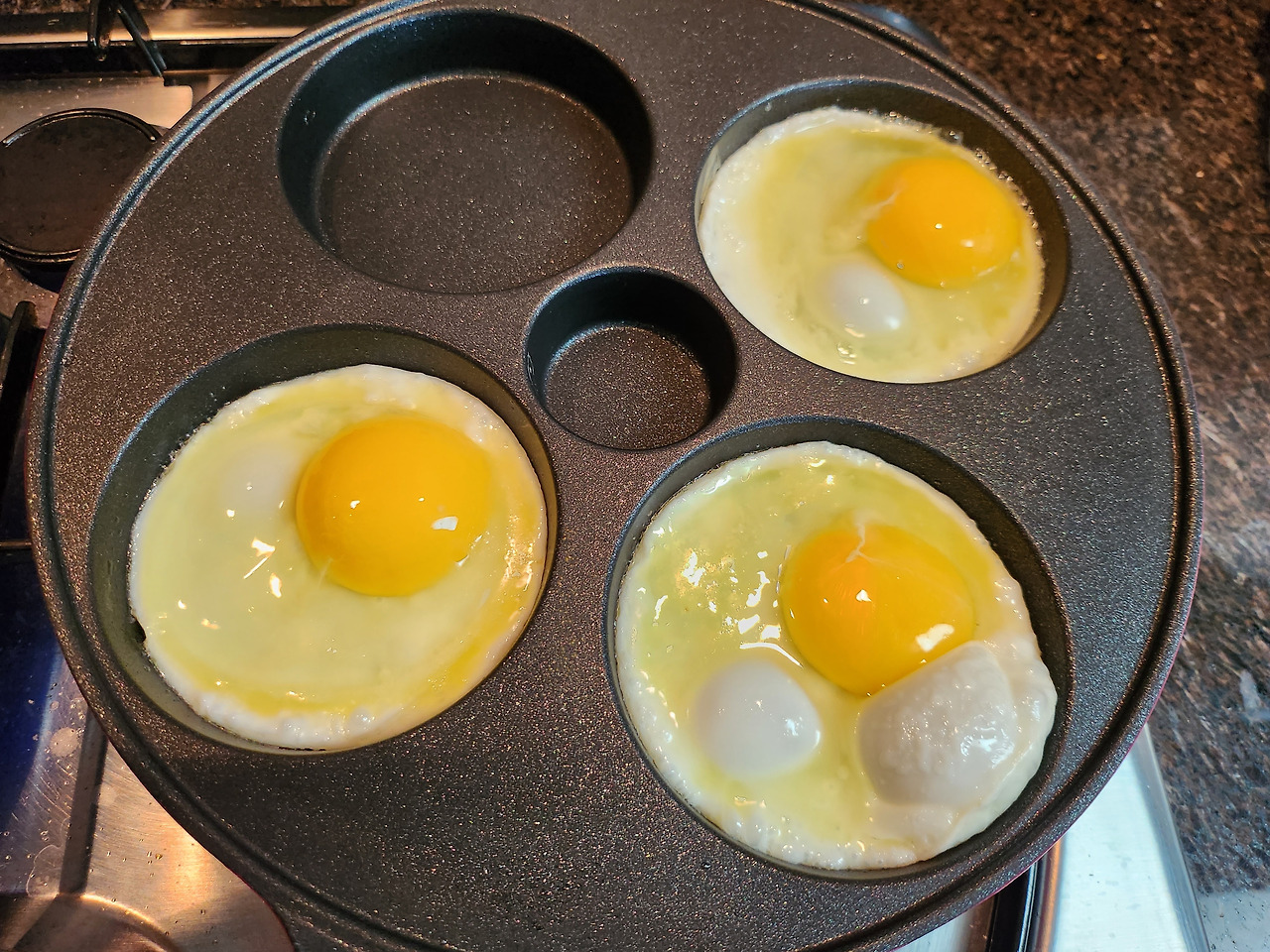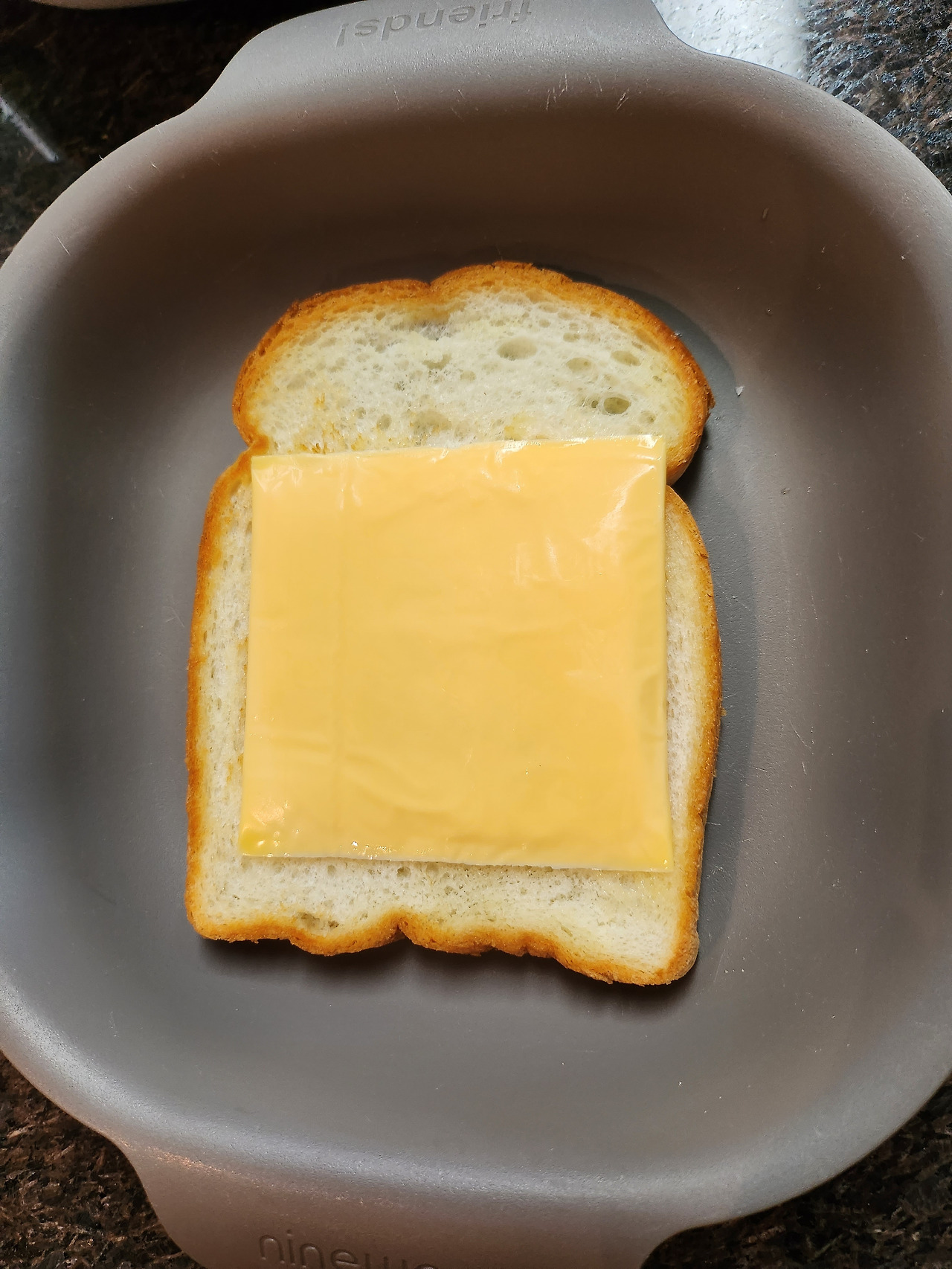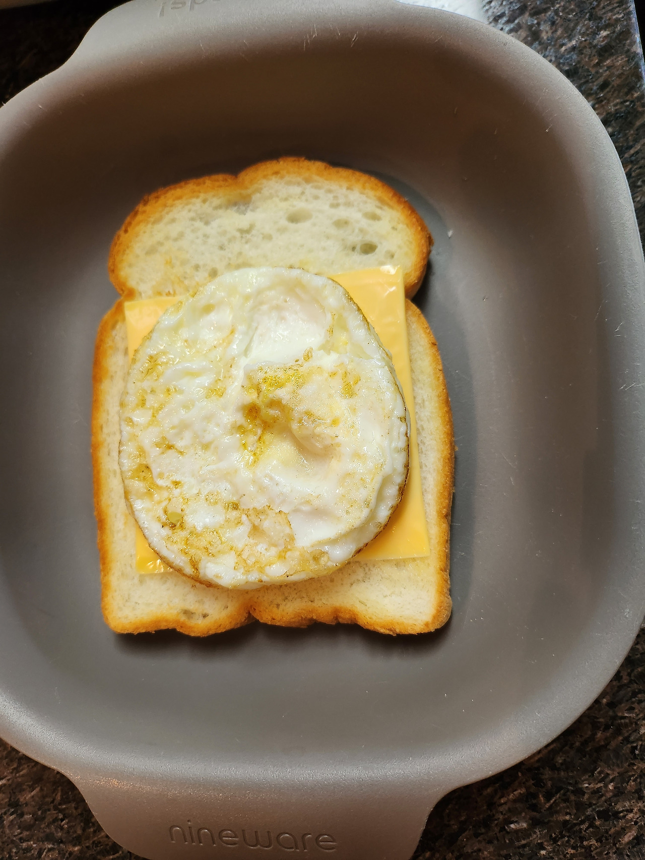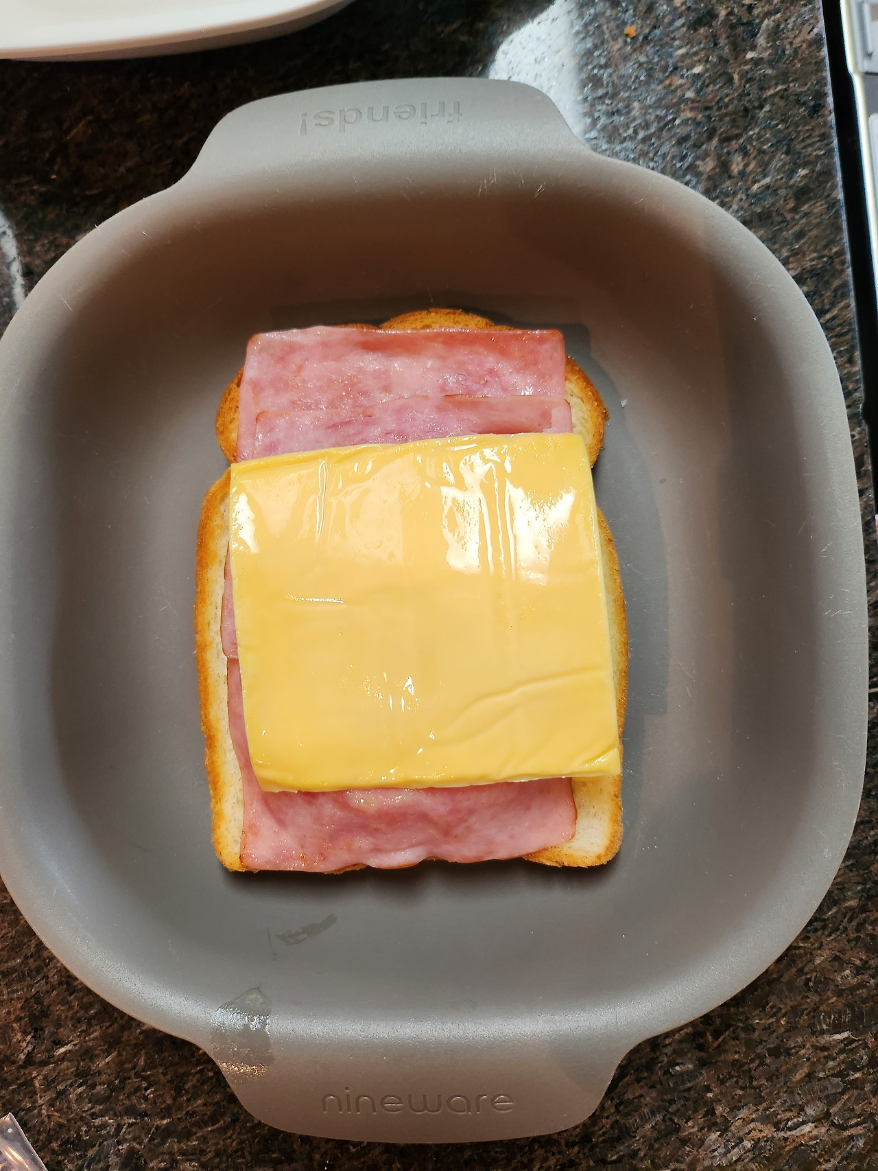 3. 식빵에 치즈, 계란, 슬라이스햄, 치즈, 식빵 순서로 얹기 (샐러드 채소, 렌치드레싱 또는 케첩 등을 곁들여도 OK!)