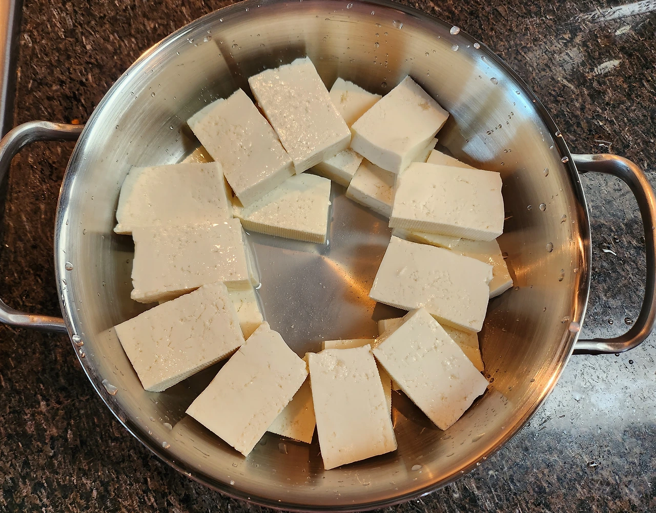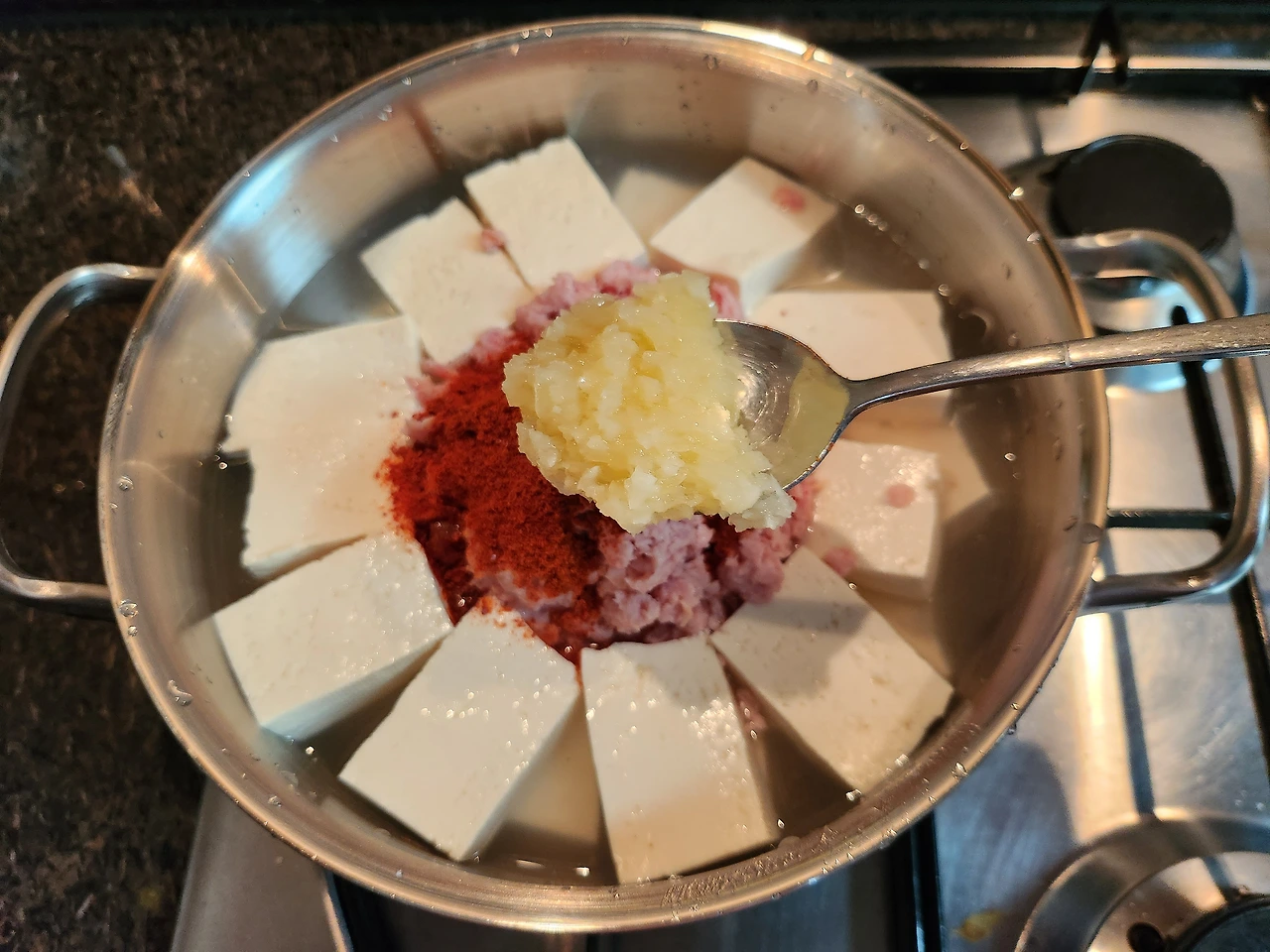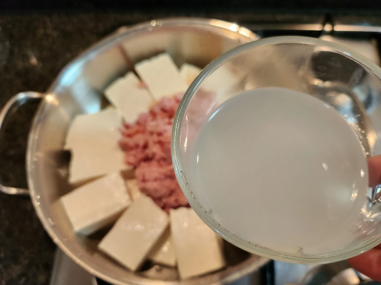 4. 쌀뜨물 또는 생수를 두부가 자작하게 잠길 정도만 넣어줘요.