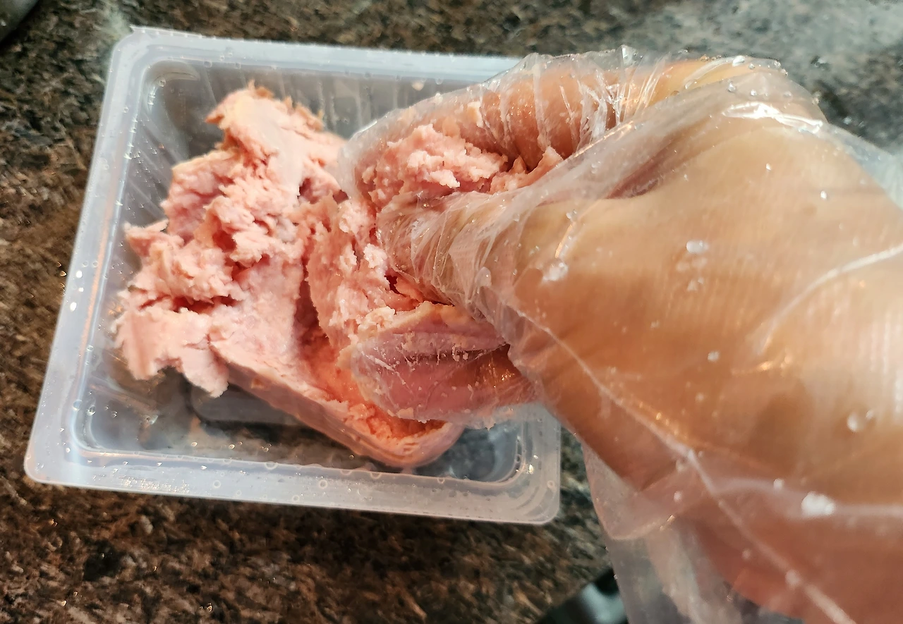 3. 두부를 동그랗게 둘러준 후 가운데에 으깬 스팸이나 다짐육을 넣어줍니다.