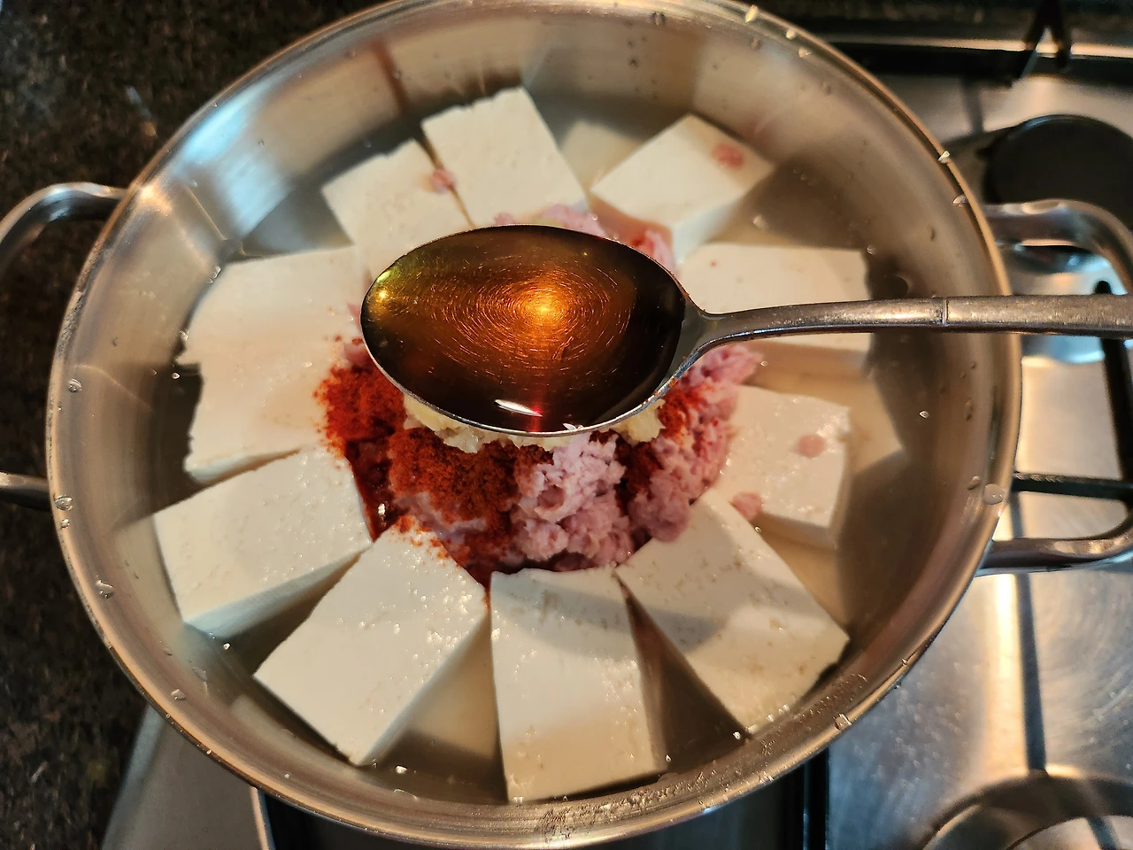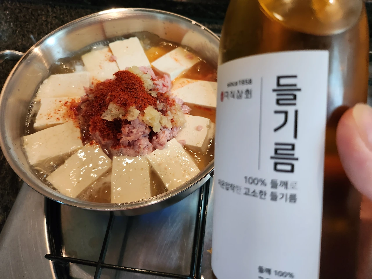 6. 동전육수 2~3알(멸치 육수를 생수대신 사용했다면 생략해도 좋아요.)을 넣어준 뒤, 들기름을 2~3큰술 정도 둘러주세요. (참기름 X, 꼭 들기름으로요... 두부의 고소한 맛과 감칠맛을 살려줍니다.)