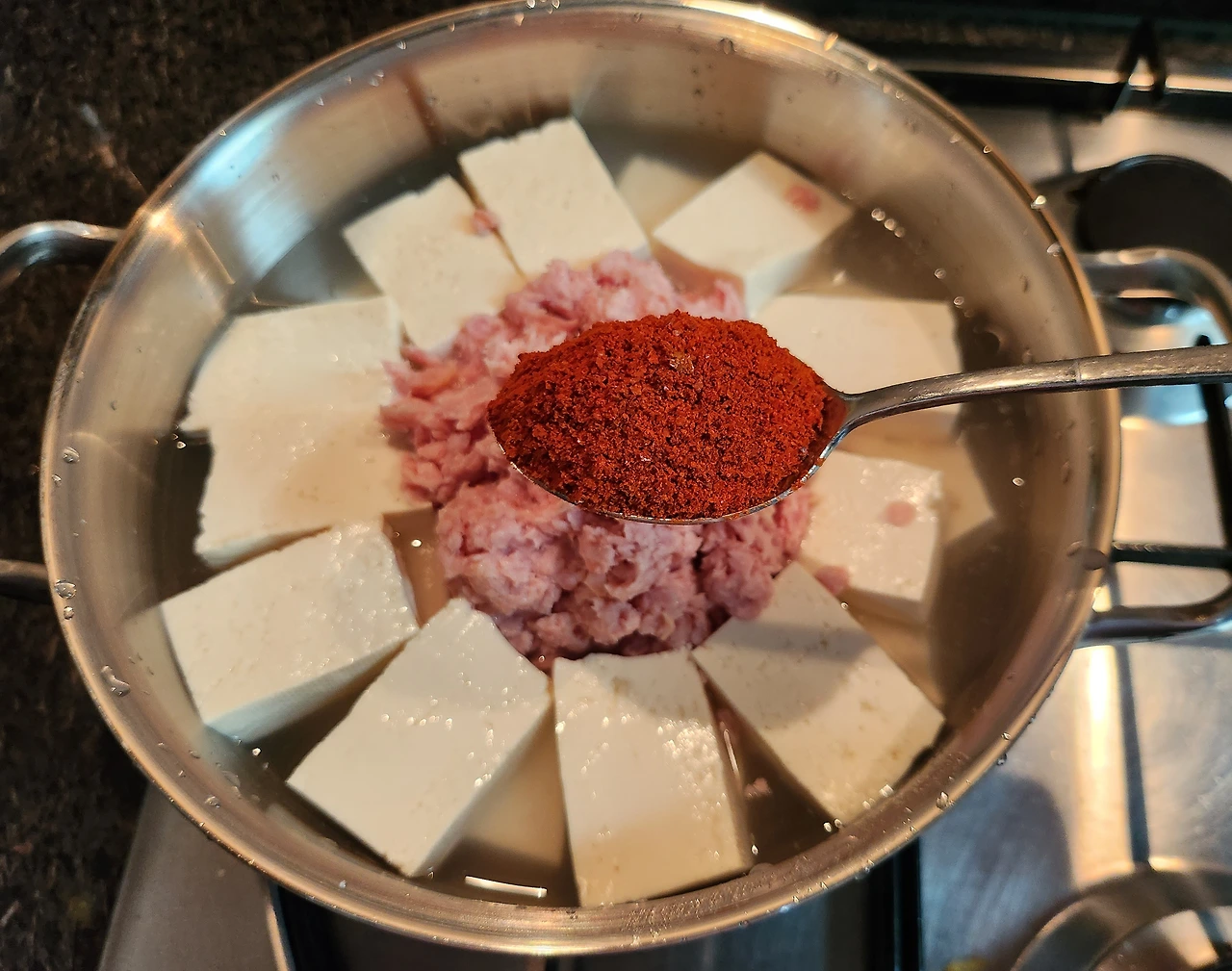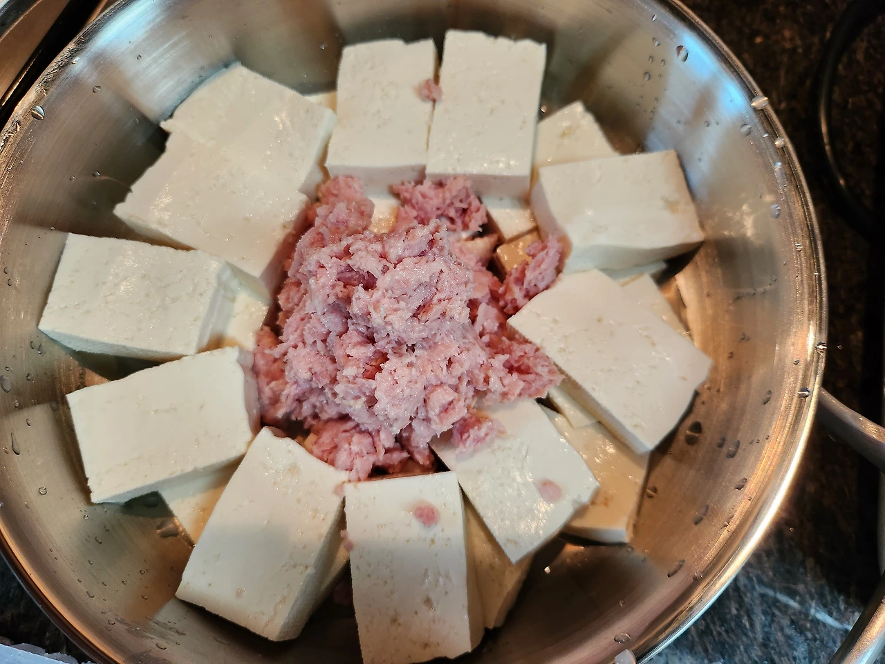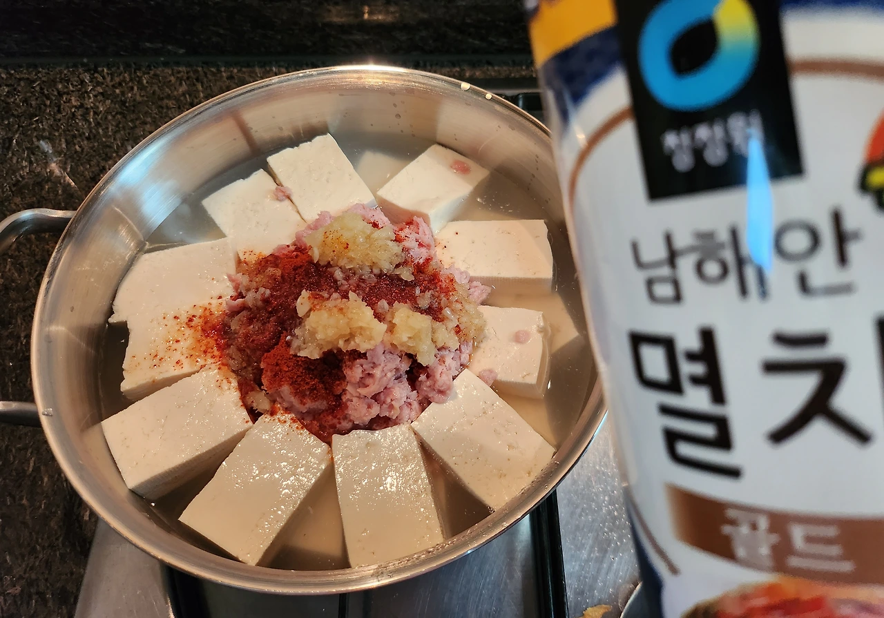 ◉ 재료 : 두부두모, 스팸, 대파, 동전육수, 다진 마늘, 고춧가루, 멸치액젓, 쌀뜨물
