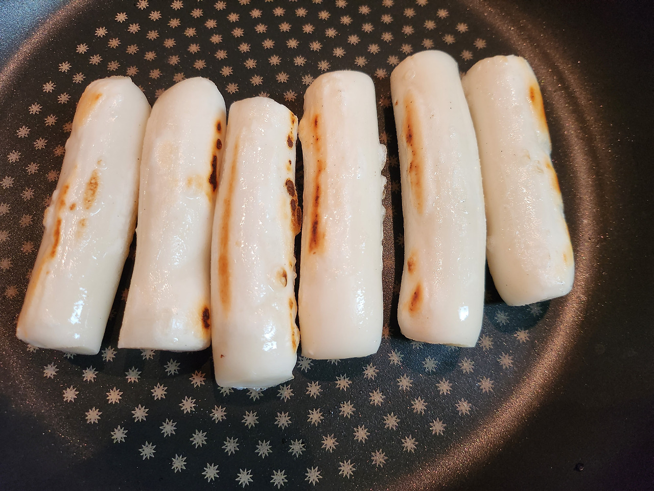 - 기름 없이 달궈진 프라이팬에 가래떡을 얹고 맹물 한 두 스푼 정도 프라이팬 가장자리에 끼얹은 후 뚜껑을 덮고 약불로 뜸을 들인다.