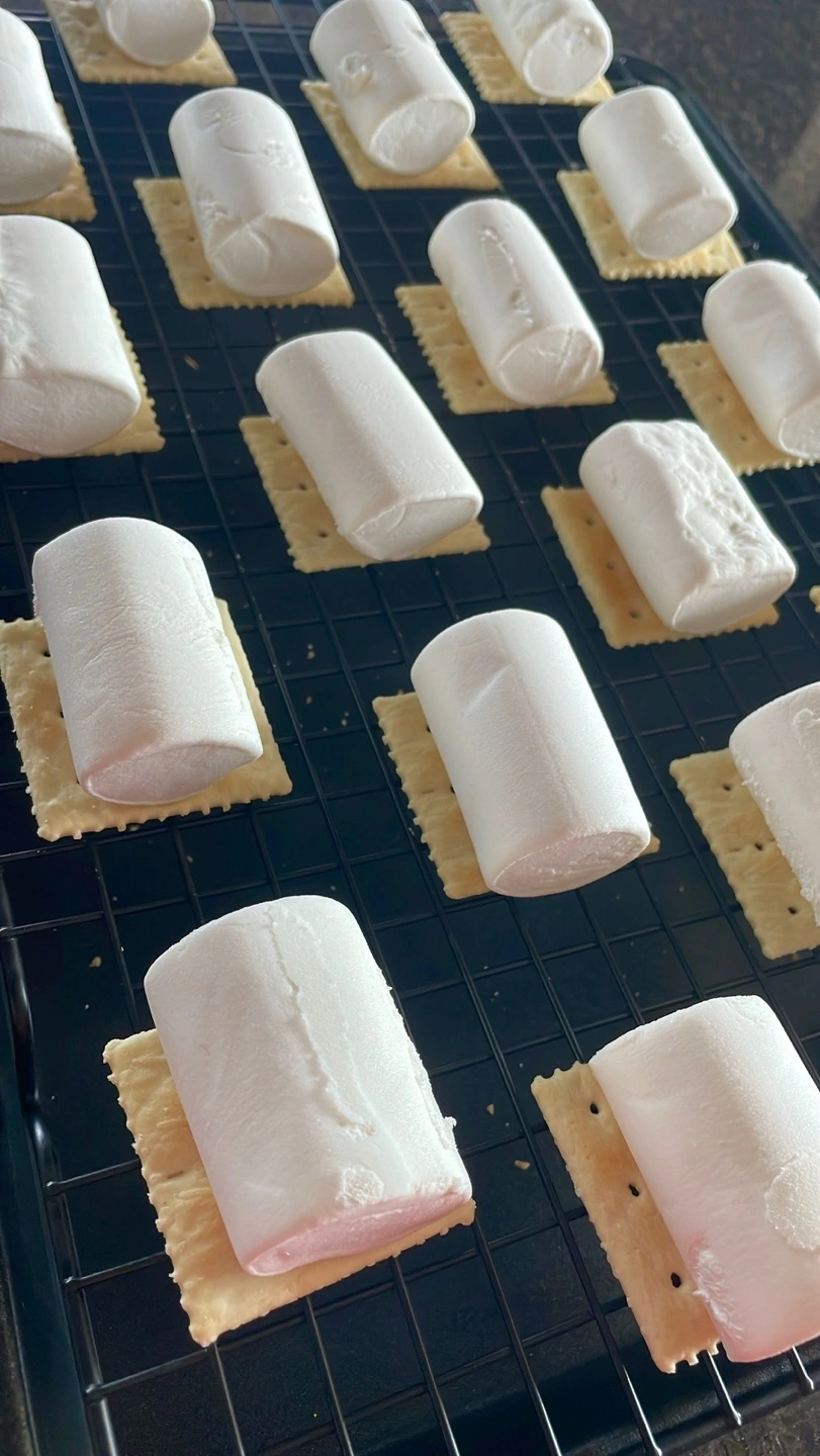 1. 팬닝 : 참 크래커를 듬성듬성, 마시멜로가 부풀어 오를 정도의 간격을 띄우고 올린 후 그 위에 마시멜로를 놓아줍니다. (단, 원통을 세우면 '아니 아니 아니 되오~~~~')