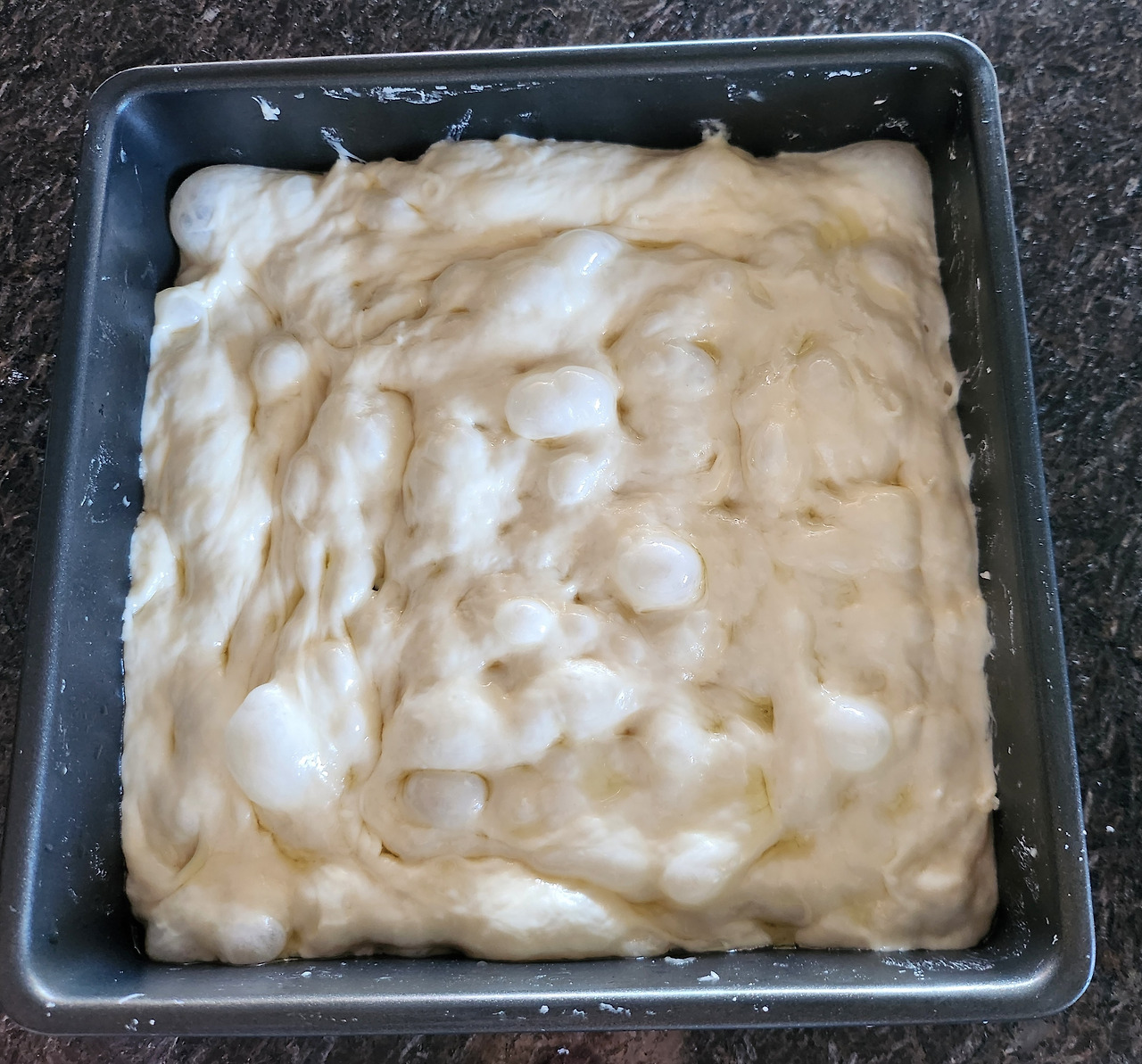6. 성형과 팬닝 : 4회 폴딩이 마쳐지면 팬에 올리브유를 뿌려 코팅해 주세요. 열 손가락을 펼쳐 반죽을 콕콕 눌러가며 팬에 맞게 펼쳐주세요. 이때 발효 기포가 꺼지지 않도록 살살 펼치는 것, 잊지 마세요