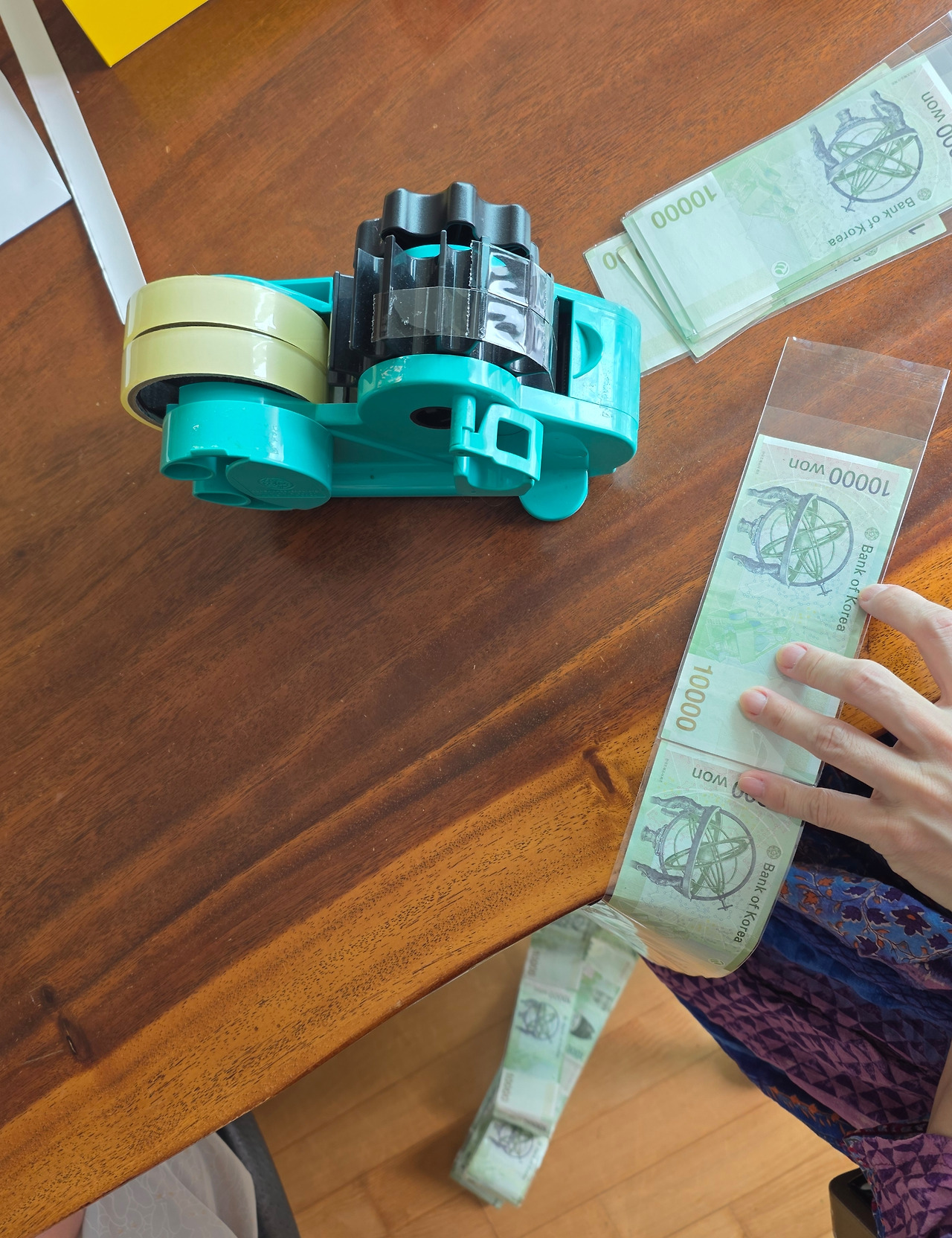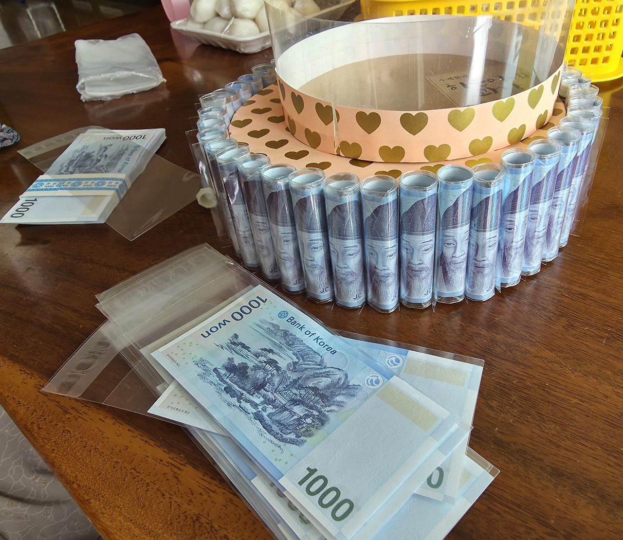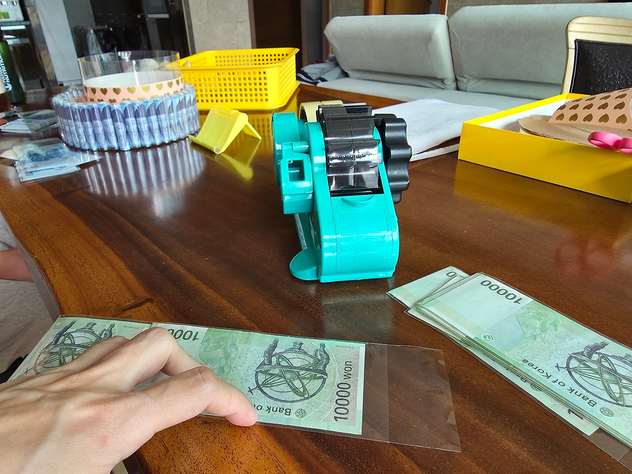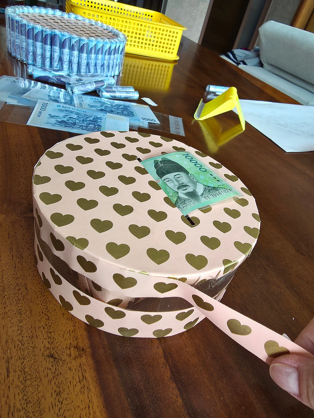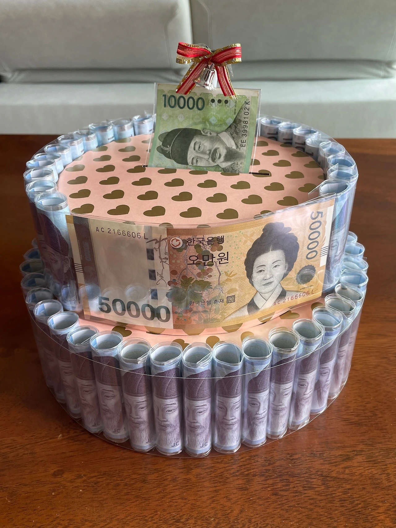 처음엔 만 원짜리로 케이크 둘레를 꾸밀까 하다가 천 원짜리로 바꾸었다.