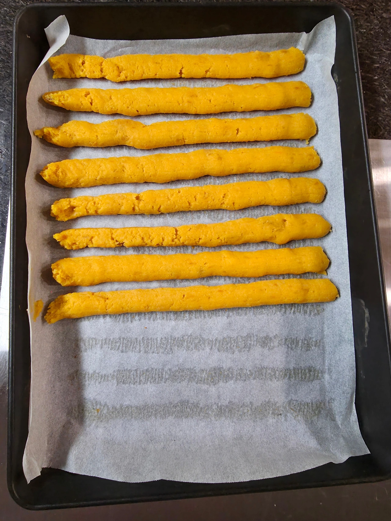 - 또는, 반죽을 손가락 길이로 길게 빚어 오븐팬에 가지런히 놓습니다.