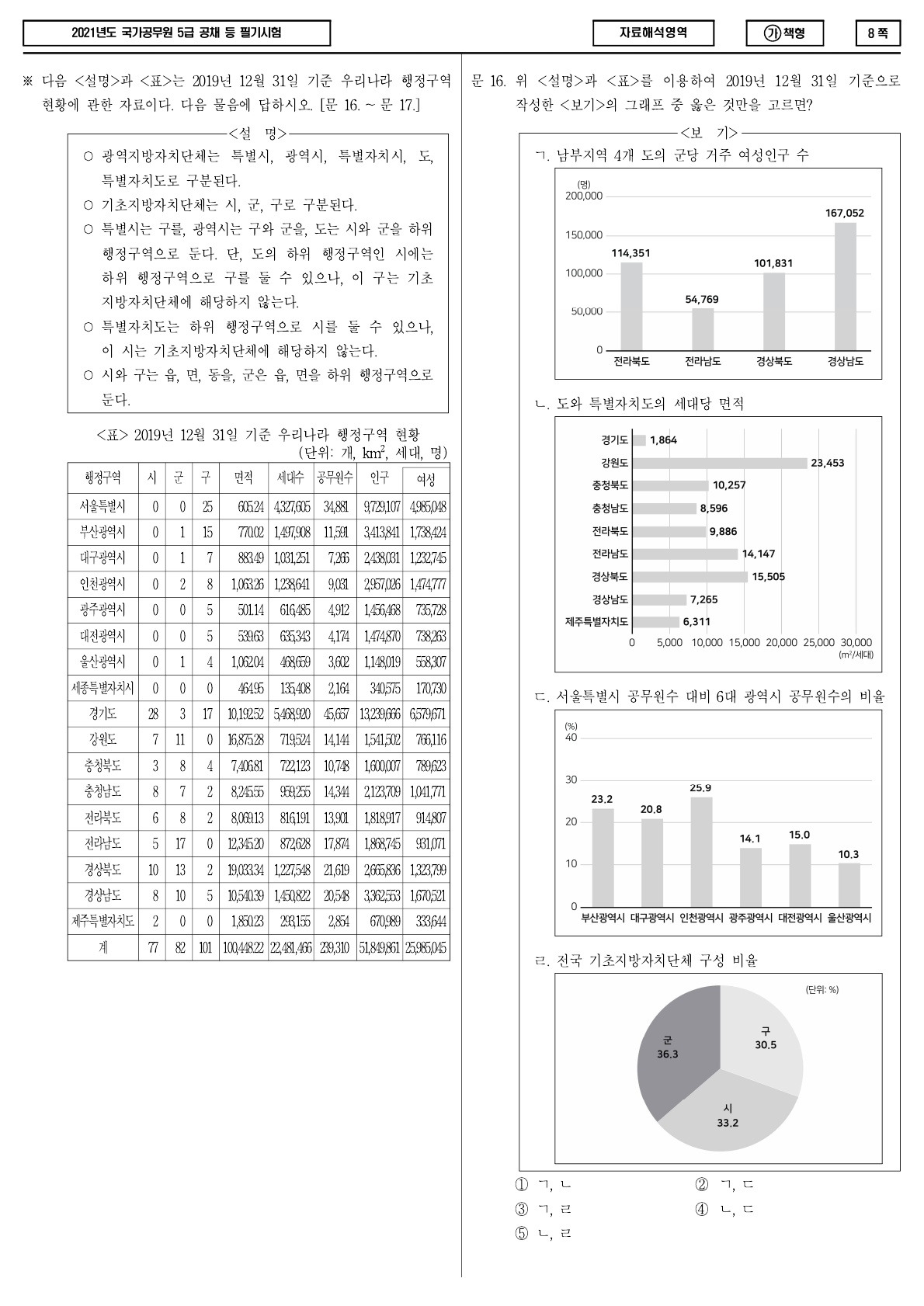 ㄹ은 기초지자체 구성비율인데, 문제의 <설 명> 보기를 읽지 않으면 틀릴 우려가 있다. 내 경험상 원형 그래프는 특정 값의 비중이 다른 값들의 모양에 영향을 줄 수밖에 없는 형태의 그래프라 (비중이 드러나지 않는 막대그래프 등은 개별 값만 왜곡하기가 쉽다) 틀린 수치를 넣어두는 경우가 비교적 적은 편인데, ㄹ도 결국 옳은 그래프였다. 그러나 이를 판단하려면 기초지자체 수를 정확히 파악한 후 (시 75, 군 82, 구 69, 전체 226개) 비중을 따져야 해서 이 역시 시간이 걸린다.