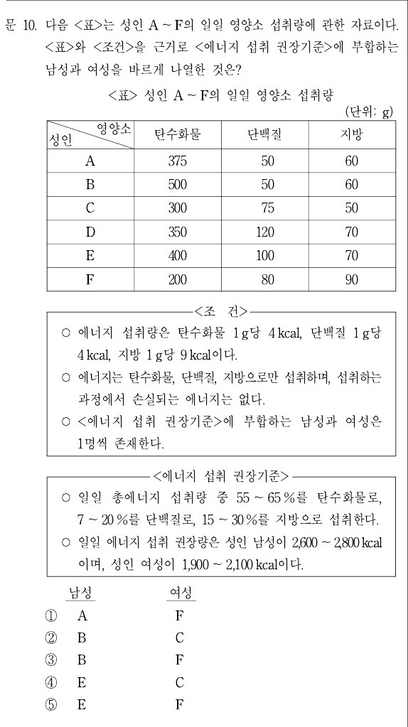 (문두를 읽고) <에너지 섭취 권장기준>에 부합하는 남녀를 찾는 것이군. (선지로 내려간다) 선지를 보니 남성은 B와 E, 여자는 C와 F만 비교하면 되네. (A는 하나 있으니 무시) 그렇다면 먼저 B/E를 남성 기준에서 판단하고, C/F를 여성 기준에서 판단하면 되겠다.