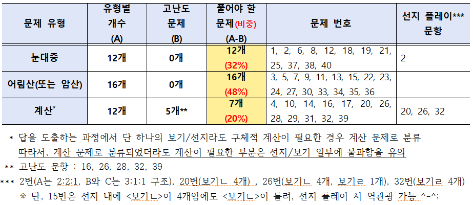 너무 쉬운 문제를 들고 와서 설명하는 것 아니냐며 눈을 치켜뜨는 사람도 있을 수 있겠다. 그렇다고 내가 모든 문제를 이렇게 하나하나 해설할 수도 없는 노릇(그러면 올해 PSAT 시험 이전에 상황판단 이야기를 할 수가 없다..!)이니, 정 의심스럽다면 2021년 자료해석 기출문제 중 계산문제로 분류한 아래 12개 문제를 한 번쯤 풀어보자. 아마 고난도 문항으로 분류한 16, 26, 28, 32, 39번을 제외하곤 위 문제(10번)와 비슷한 수준일 것이다.