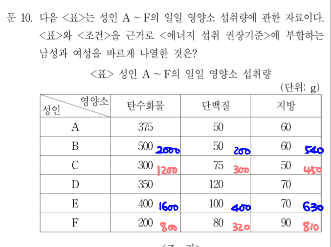 위 문제는 전형적인 계산문제의 특성을 띠고 있다. <조 건>과 <에너지 섭취 권장기준>이라는 두 개의 보기에서 숫자를 언급하는 모양새만 봐도 심상치 않다.