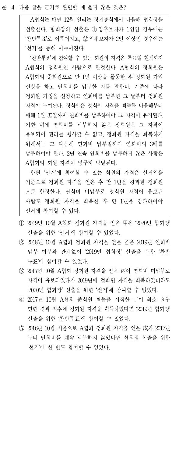 즉 지문을 잘 읽어도 답을 단박에 찾을 수 없고 (언어논리는 대체로 지문만 잘 읽으면 된다) 다섯 개의 선지를 하나씩 판단해야만 한다. 왼쪽 문제와 비교하면 (단순 비교할 수는 없지만) 판단해야 하는 <상황>(정보량)이 다섯 배에 이르는 셈이다.