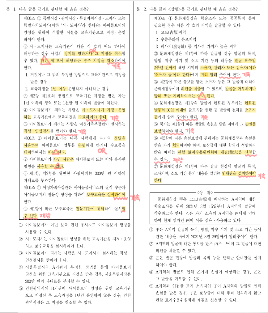 법조문 문제는 형태에 따라 ①법조문을 발췌(복붙)한 형태 거나, ②조문 내용을 줄글로 풀어쓴 형태로 나뉘는데 풀이 방법은 동일하다. 위에서 법조문의 서술 법칙에 대해 이야기했는데, 이러한 법칙 덕에 풀이법이 복잡하지 않다. 언어논리 문제와 마찬가지로 통독하면 된다.