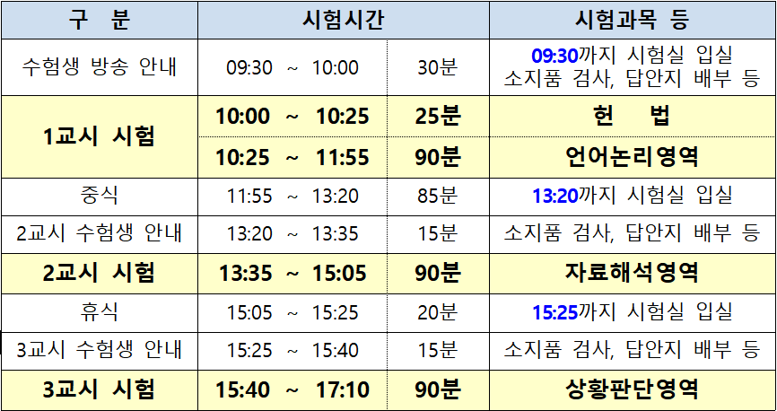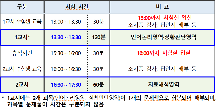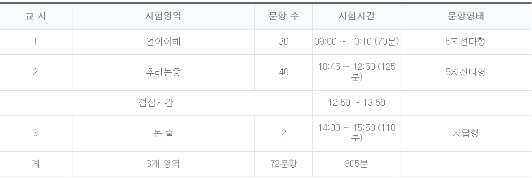 LEET는 언어이해, 추리논증, 논술로 구성되는데 사실상 논술의 중요성이 매우 낮다는 점 (LEET 준비생들은 논술을 백일장 쓰는 수준으로 생각하는 듯하다)을 고려하면 언어이해, 추리논증 두 과목으로 구성된 시험이라 해도 무방하다. 시험 시간은 아래와 같다.
