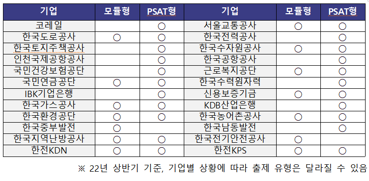 실제 대부분의 NCS 수험서 또한 NCS 시험의 문제 유형을 ①모듈형(산업인력공단의 NCS 학습모듈 교재 내용을 기반으로 한 문제), ②피셋형, ③피듈형(모듈형+피셋형)으로 구분하고 있다. 또한 모듈형 문제는 일부 기업에서만 출제되는 데에 비해 PSAT형 문제는 거의 모든 기업에서 출제된다는 점을 고려하면 유사성은 생각보다 높다. (하단 표 참조)