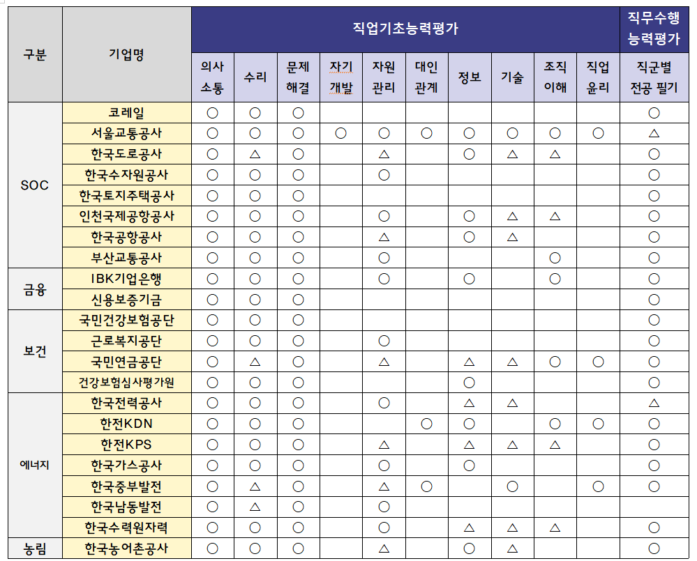 최근 공기업은 지원자의 역량을 판단하기 위해 학벌/스펙보다는 NCS 시험을 적극적으로 활용하고 있으며, NCS 분류를 바탕으로 각자 자기 기업에 적합한 인재를 선발하기 위한 시험 문제를 구성한다.