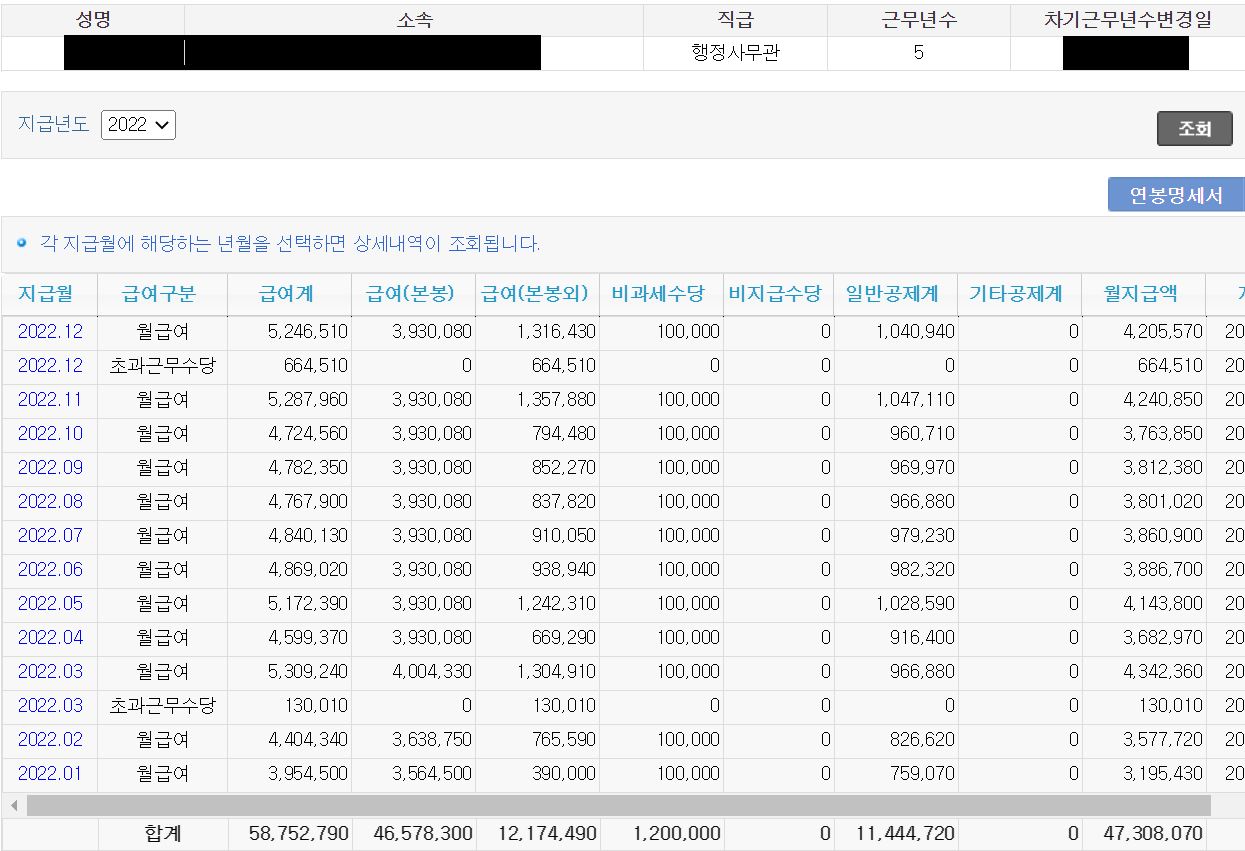 정리하자면 4년 차 군필(6년 차, 5-6호봉) 사무관은 대략 세전 6,000만원 언저리의 연봉을 받는다고 보면 된다. (실수령액은 월 360~420을 오가 편차가 있는 편이다)