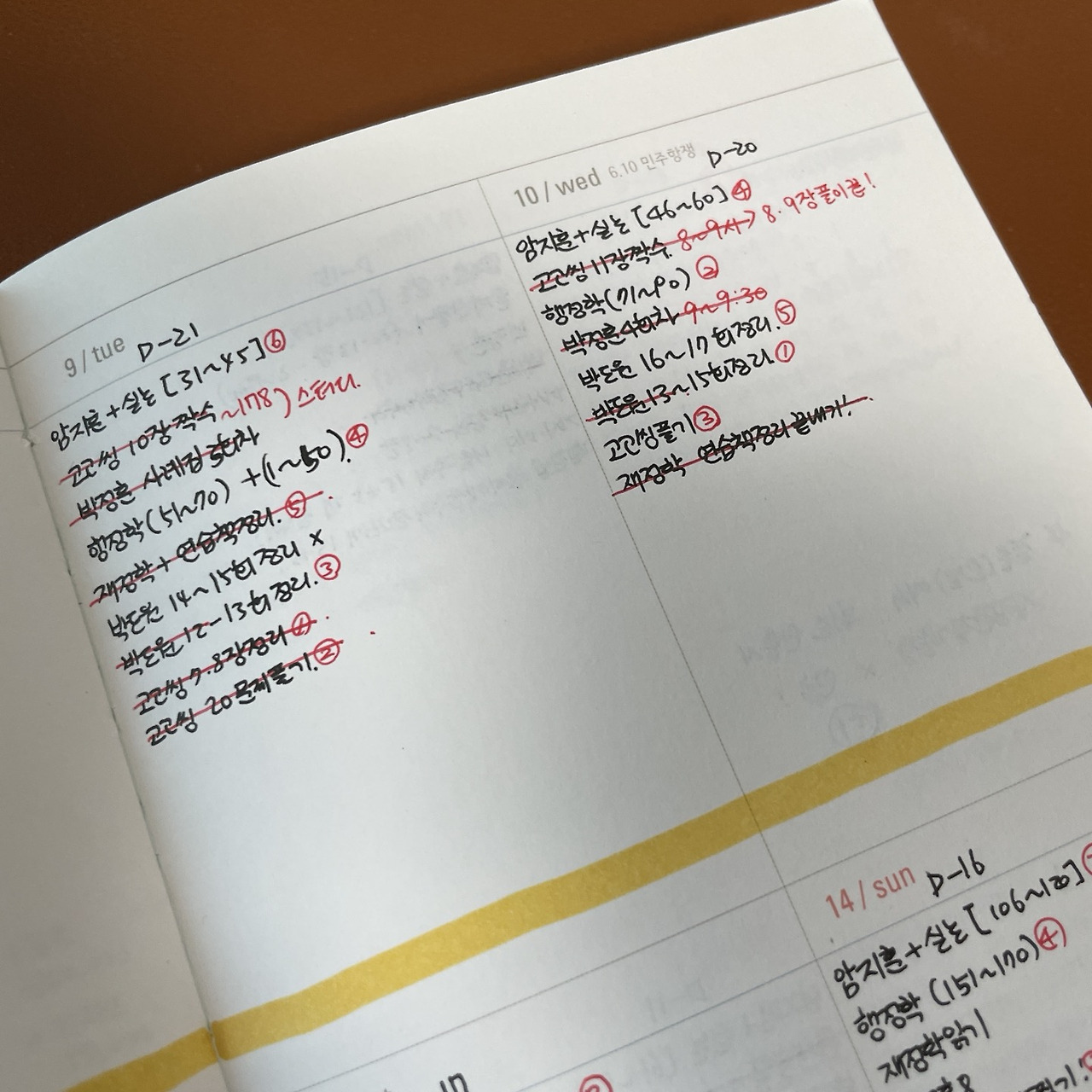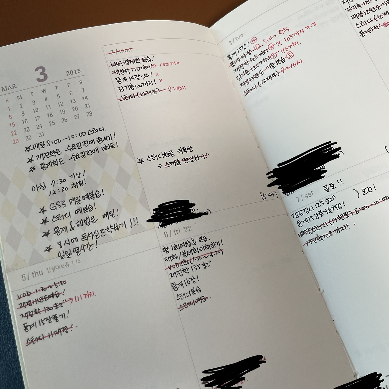 위 사진은 2015년 재시생 시절 내가 직접 썼던 다이어리다. 좌측은 3순환이 한창 진행되던 무렵이고, 우측은 2차 시험을 3주 앞둔 6월 중순이다. 하루 일과가 '~까지 풀기', '~까지 정리' 등 정량적 목표로 가득하다. 결과는 어땠을까? (다른 요소들도 영향을 미쳤겠지만) 처참했다. 나름 열심히 한다고 했는데 성적은 커트라인과는 한참 떨어져 있었다. 당시에는 주간 목표도 세웠다. 'GS3 매일 예복습!', '스터디 예복습', '통계&행법은 매일!' 등 죄다 양적인 목표뿐이었다.